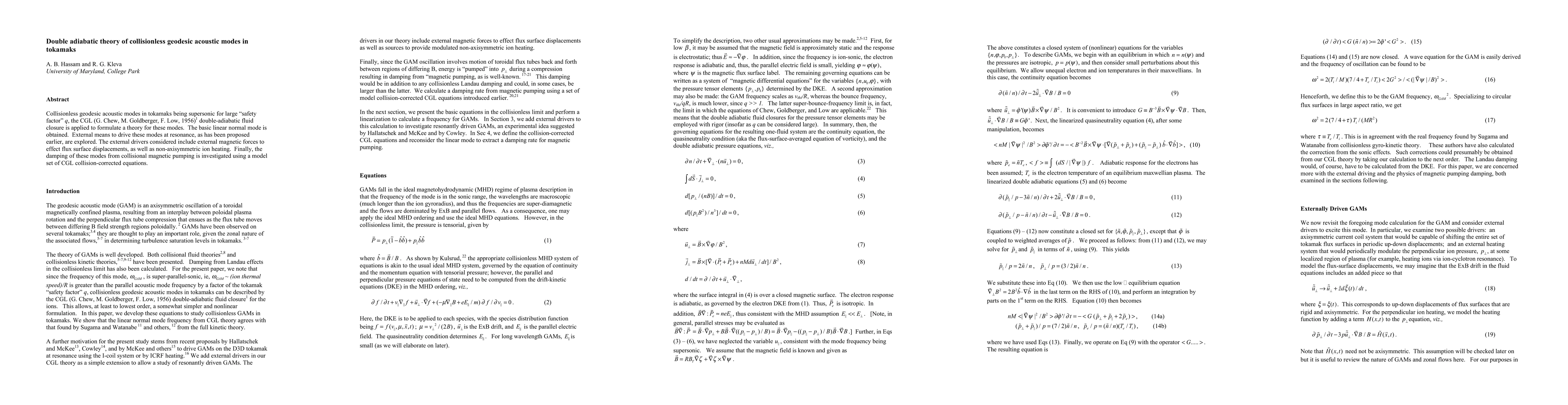 This paper develops a double-adiabatic theory for collisionless geodesic acoustic modes in tokamaks, deriving the basic linear normal mode and exploring external drivers like magnetic forces and non-axisymmetric ion heating. It also investigates damping of these modes through collisional magnetic pumping.