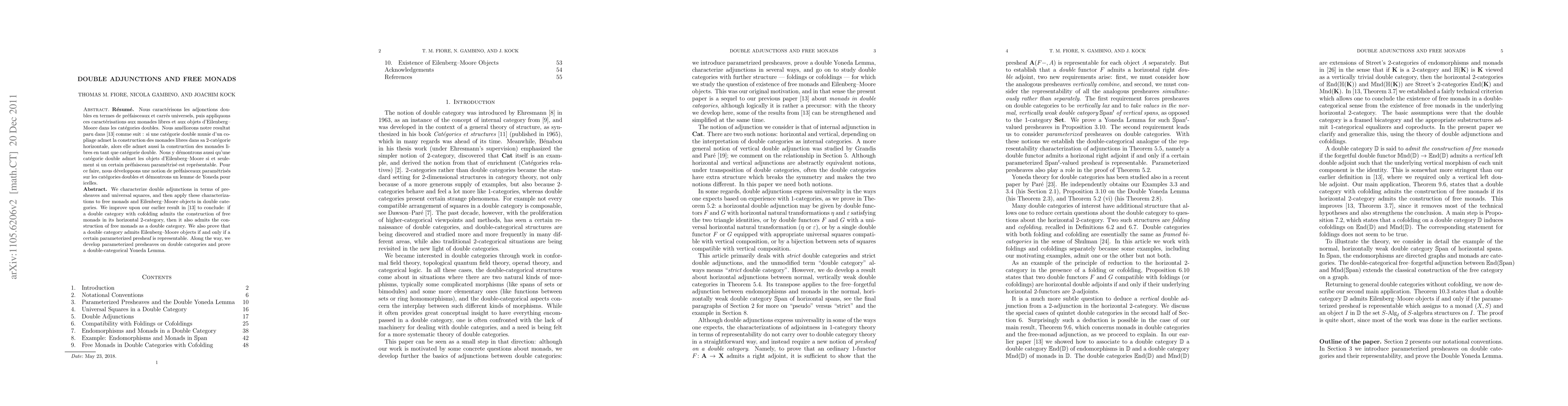 We characterize double adjunctions in terms of presheaves and universal squares, and then apply these characterizations to free monads and Eilenberg--Moore objects in double categories. We improve upon our earlier result in "Monads in Double Categories", JPAA 215:6, pages 1174-1197, 2011, to conclude: if a double category with cofolding admits the construction of free monads in its horizontal 2-category, then it also admits the construction of free monads as a double category. We also prove that a double category admits Eilenberg--Moore objects if and only if a certain parameterized presheaf is representable. Along the way, we develop parameterized presheaves on double categories and prove a double-categorical Yoneda Lemma.