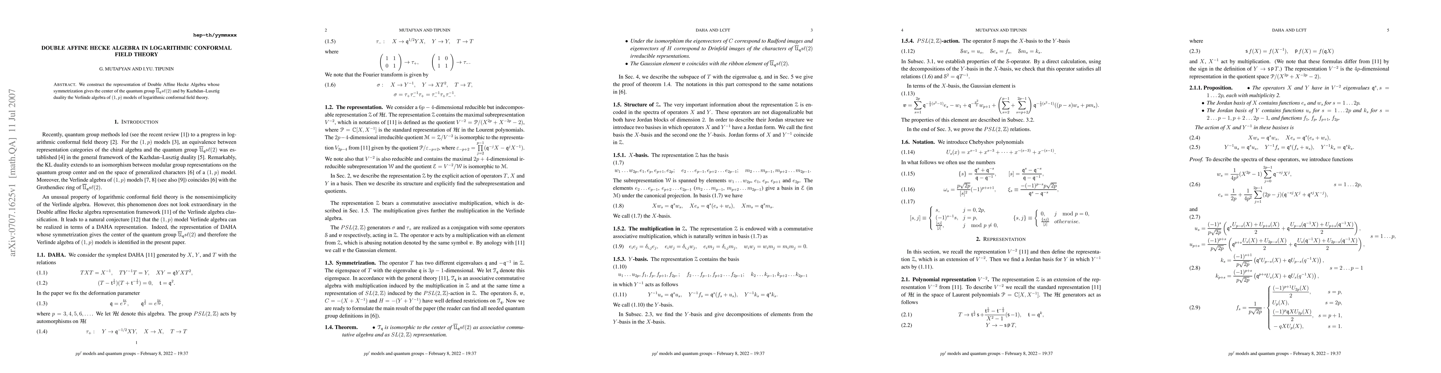 We construct the representation of Double Affine Hecke Algebra whose symmetrization gives the center of the quantum group U_q(sl(2)) and by Kazhdan--Lusztig duality the Verlinde algebra of (1,p) models of logarithmic conformal field theory.