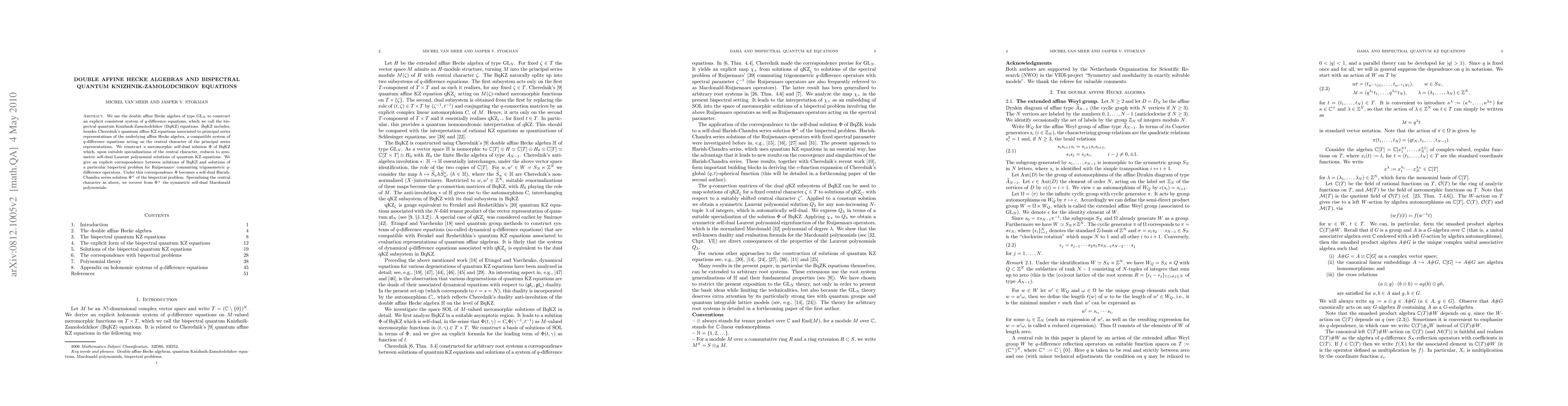 We use the double affine Hecke algebra of type GL_N to construct an explicit consistent system of q-difference equations, which we call the bispectral quantum Knizhnik-Zamolodchikov (BqKZ) equations. BqKZ includes, besides Cherednik's quantum affine KZ equations associated to principal series representations of the underlying affine Hecke algebra, a compatible system of q-difference equations acting on the central character of the principal series representations. We construct a meromorphic self-dual solution \Phi of BqKZ which, upon suitable specializations of the central character, reduces to symmetric self-dual Laurent polynomial solutions of quantum KZ equations. We give an explicit correspondence between solutions of BqKZ and solutions of a particular bispectral problem for the Ruijsenaars' commuting trigonometric q-difference operators. Under this correspondence \Phi becomes a self-dual Harish-Chandra series solution \Phi^+ of the bispectral problem. Specializing the central character as above, we recover from \Phi^+ the symmetric self-dual Macdonald polynomials.