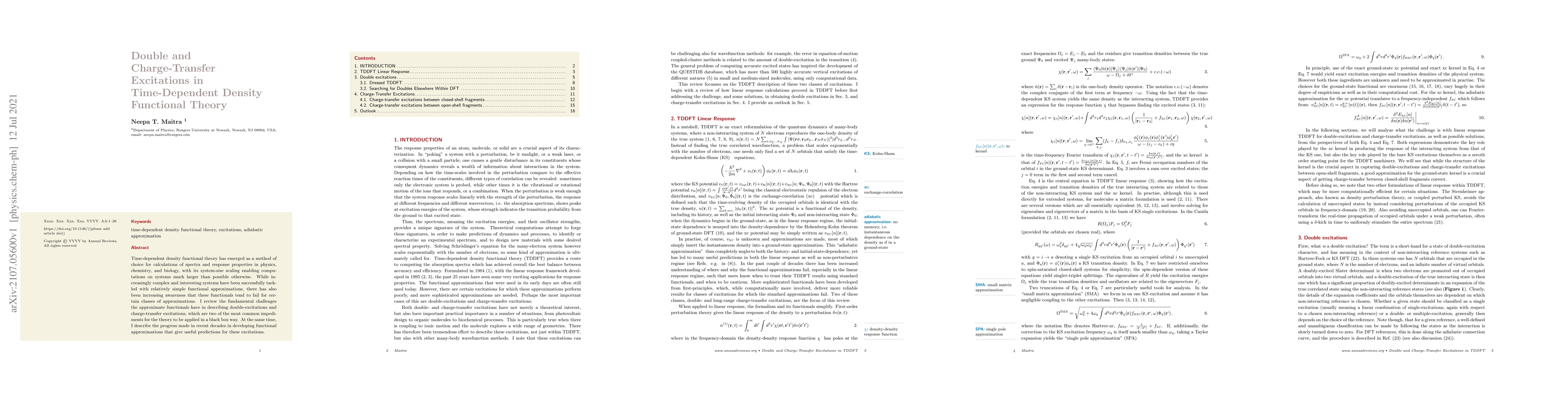 This paper reviews the challenges of time-dependent density functional theory (TDDFT) in accurately describing double and charge-transfer excitations, common issues that limit its broad applicability. It also highlights recent advancements in functional approximations that improve predictions for these complex excitations.
