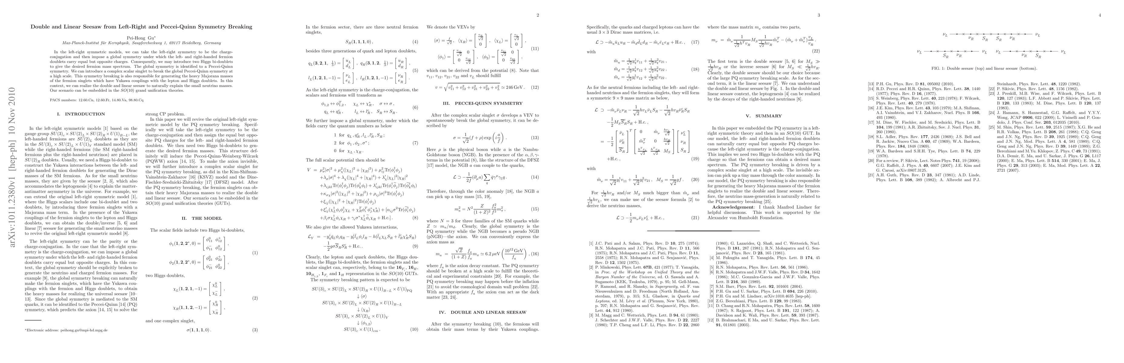 In the left-right symmetric models, we can take the left-right symmetry to be the charge-conjugation and then impose a global symmetry under which the left- and right-handed fermion doublets carry equal but opposite charges. Consequently, we may introduce two Higgs bi-doublets to give the desired fermion mass spectrum. The global symmetry is identified to a Peccei-Quinn symmetry. We can introduce a complex scalar singlet to break the global Peccei-Quinn symmetry at a high scale. This symmetry breaking is also responsible for generating the heavy Majorana masses of the fermion singlets which have Yukawa couplings with the lepton and Higgs doublets. In this context, we can realize the double and linear seesaw to naturally explain the small neutrino masses. Our scenario can be embedded in the SO(10) grand unification theories.