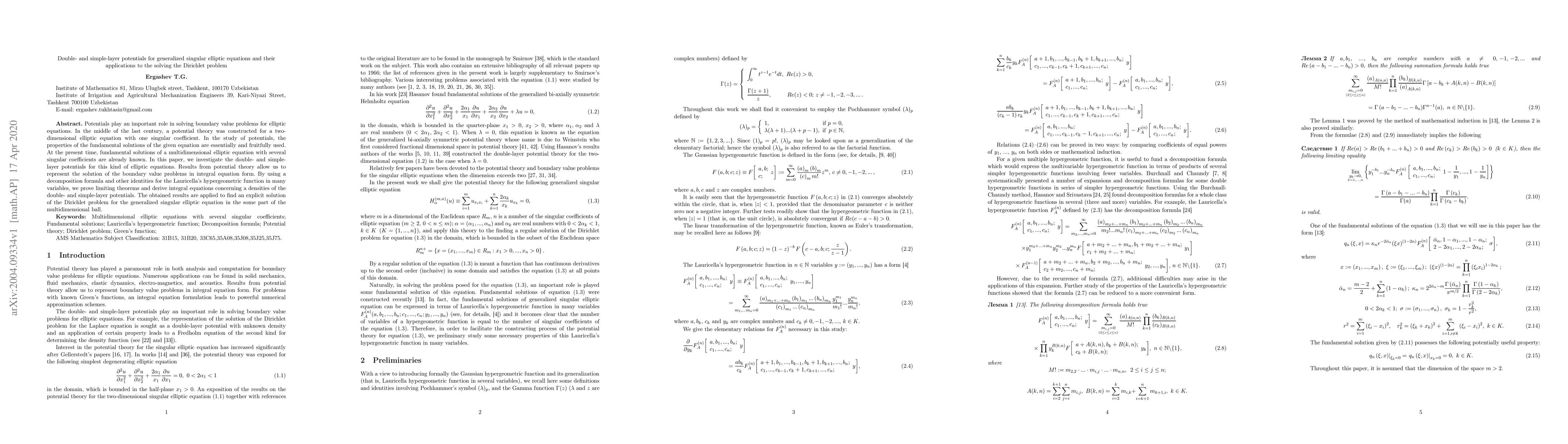 Potentials play an important role in solving boundary value problems for elliptic equations. In the middle of the last century, a potential theory was constructed for a two-dimensional elliptic equation with one singular coefficient. In the study of potentials, the properties of the fundamental solutions of the given equation are essentially and fruitfully used. At the present time, fundamental solutions of a multidimensional elliptic equation with several singular coefficients are already known. In this paper, we investigate the double- and simple-layer potentials for this kind of elliptic equations. Results from potential theory allow us to represent the solution of the boundary value problems in integral equation form. By using a decomposition formula and other identities for the Lauricella's hypergeometric function in many variables, we prove limiting theorems and derive integral equations concerning a densities of the double- and simple-layer potentials. The obtained results are applied to find an explicit solution of the Dirichlet problem for the generalized singular elliptic equation in the some part of the multidimensional ball.