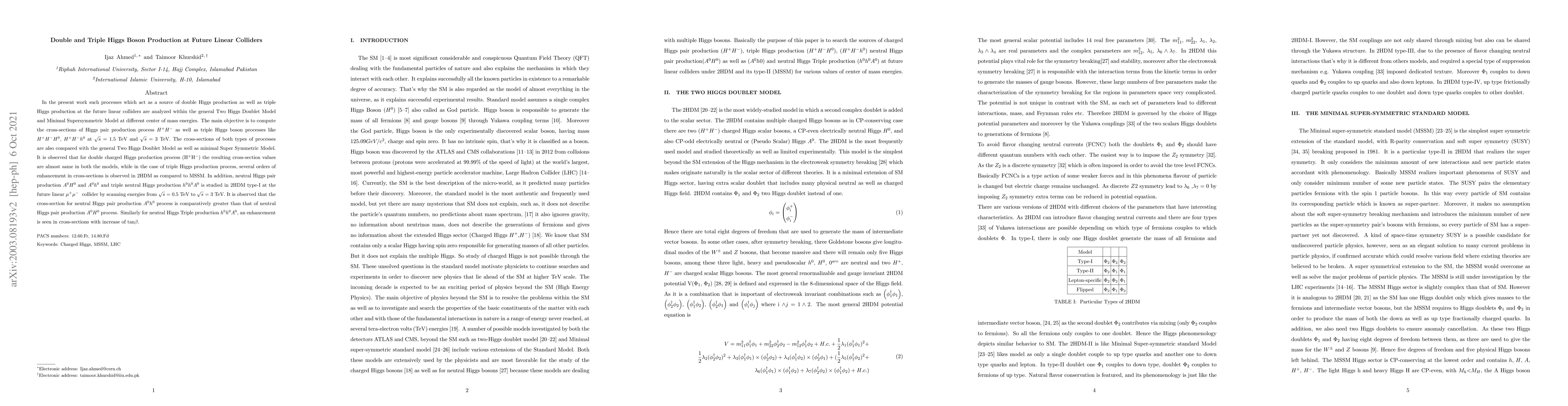 The research analyzes double and triple Higgs boson production processes at future linear colliders using the Two-Higgs-Doublet Model (2HDM) and its special type-II (Minimal Supersymmetric Standard Model, MSSM). It compares cross-sections for double charged Higgs production (H+H-) and triple Higgs production (H+H-H0, H+H-h0) at 1.5 TeV and 3 TeV center of mass energies.