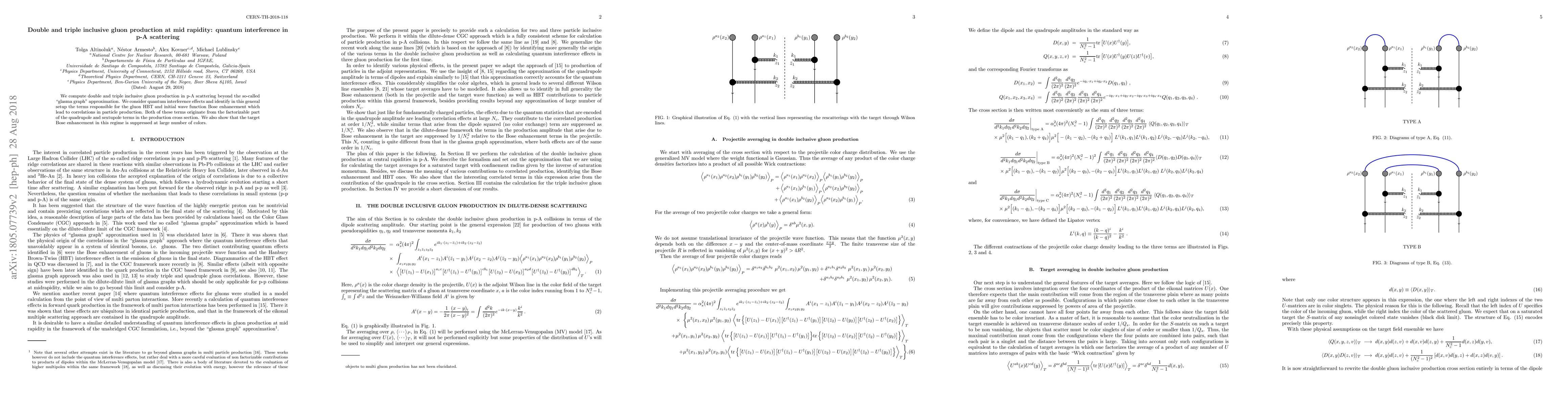 We compute double and triple inclusive gluon production in p-A scattering beyond the so-called "glasma graph" approximation. We consider quantum interference effects and identify in this general setup the terms responsible for the gluon HBT and initial wave function Bose enhancement which lead to correlations in particle production. Both of these terms originate from the factorizable part of the quadrupole and sextupole terms in the production cross section. We also show that the target Bose enhancement in this regime is suppressed at large number of colors.