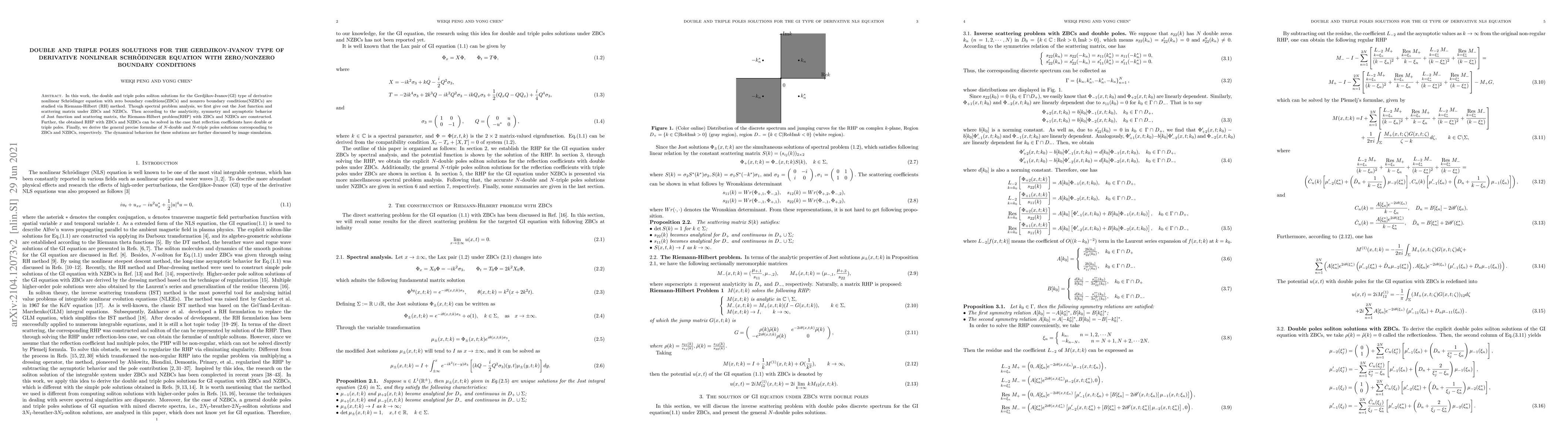 In this work, the double and triple poles soliton solutions for the Gerdjikov-Ivanov(GI) type of derivative nonlinear Schr\"{o}dinger equation with zero boundary conditions(ZBCs) and nonzero boundary conditions(NZBCs) are studied via Riemann-Hilbert (RH) method. Though spectral problem analysis, we first give out the Jost function and scattering matrix under ZBCs and NZBCs. Then according to the analyticity, symmetry and asymptotic behavior of Jost function and scattering matrix, the Riemann-Hilbert problem(RHP) with ZBCs and NZBCs are constructed. Further, the obtained RHP with ZBCs and NZBCs can be solved in the case that reflection coefficients have double or triple poles. Finally, we derive the general precise formulae of N-double and N-triple poles solutions corresponding to ZBCs and NZBCs, respectively. The dynamical behaviors for these solutions are further discussed by image simulation.