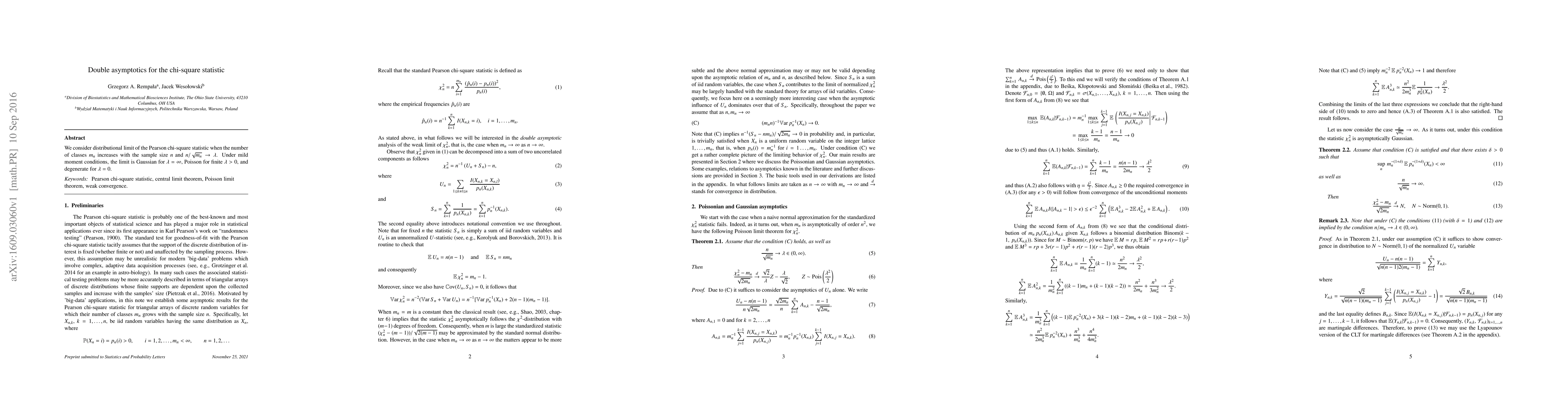 The chi-square statistic converges to a Gaussian distribution for large classes ({ }m{©}{±}∞−), a Poisson distribution for small classes (finite {«}π > 0), and a degenerate distribution for zero classes, under certain moment conditions.