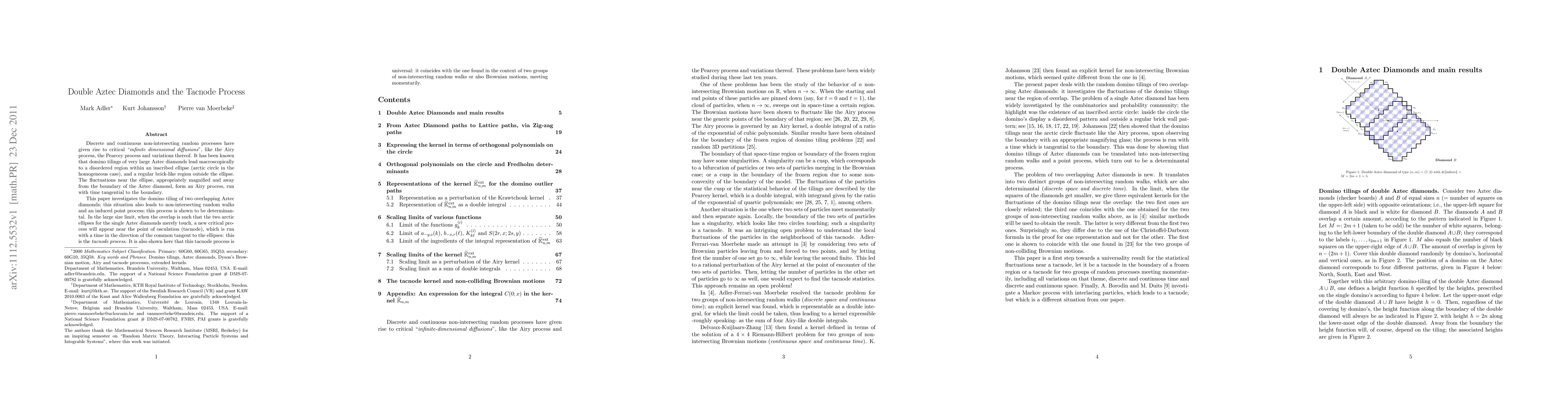 Discrete and continuous non-intersecting random processes have given rise to critical "infinite dimensional diffusions", like the Airy process, the Pearcey process and variations thereof. It has been known that domino tilings of very large Aztec diamonds lead macroscopically to a disordered region within an inscribed ellipse (arctic circle in the homogeneous case), and a regular brick-like region outside the ellipse. The fluctuations near the ellipse, appropriately magnified and away from the boundary of the Aztec diamond, form an Airy process, run with time tangential to the boundary. This paper investigates the domino tiling of two overlapping Aztec diamonds; this situation also leads to non-intersecting random walks and an induced point process; this process is shown to be determinantal. In the large size limit, when the overlap is such that the two arctic ellipses for the single Aztec diamonds merely touch, a new critical process will appear near the point of osculation (tacnode), which is run with a time in the direction of the common tangent to the ellipses: this is the "tacnode process". It is also shown here that this tacnode process is universal: it coincides with the one found in the context of two groups of non-intersecting random walks or also Brownian motions, meeting momentarily.