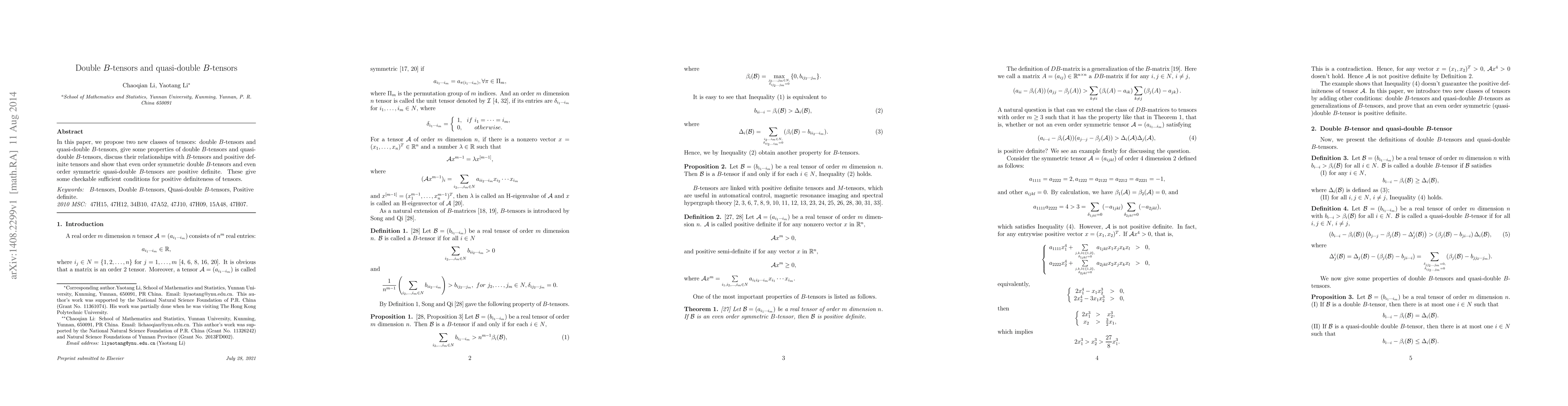 In this paper, we propose two new classes of tensors: double B-tensors and quasi-double B-tensors, give some properties of double B-tensors and quasi-double B-tensors, discuss their relationships with B-tensors and positive definite tensors and show that even order symmetric double B-tensors and even order symmetric quasi-double B-tensors are positive definite. These give some checkable sufficient conditions for positive definiteness of tensors.