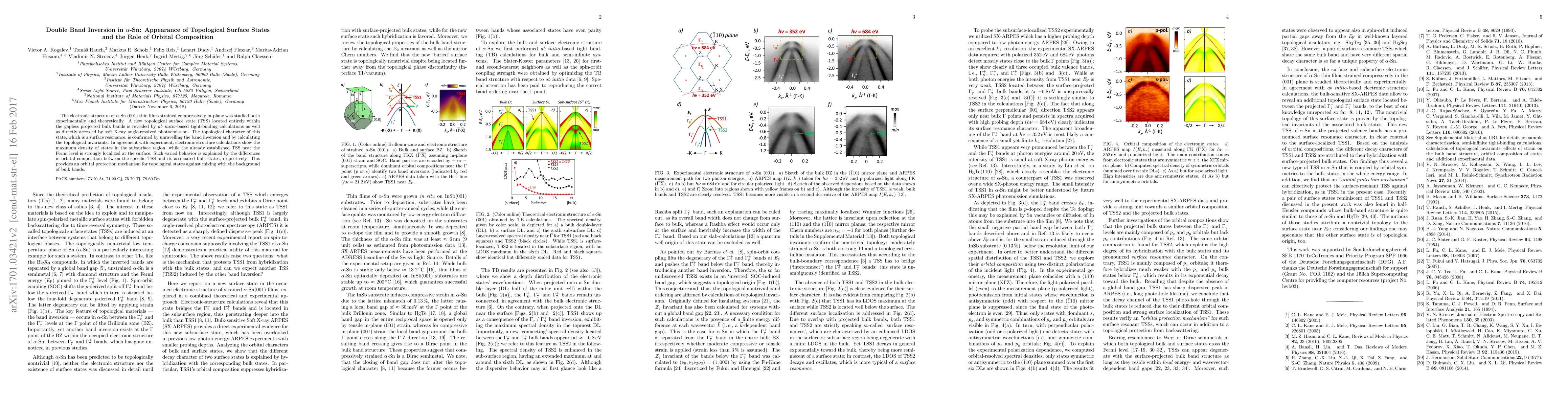 The electronic structure of \graySn(001) thin films strained compressively in-plane was studied both experimentally and theoretically. A new topological surface state (TSS) located entirely within the gapless projected bulk bands is revealed by \textit{ab initio}-based tight-binding calculations as well as directly accessed by soft X-ray angle-resolved photoemission. The topological character of this state, which is a surface resonance, is confirmed by unravelling the band inversion and by calculating the topological invariants. In agreement with experiment, electronic structure calculations show the maximum density of states in the subsurface region, while the already established TSS near the Fermi level is strongly localized at the surface. Such varied behavior is explained by the differences in orbital composition between the specific TSS and its associated bulk states, respectively. This provides an orbital protection mechanism for topological states against mixing with the background of bulk bands.