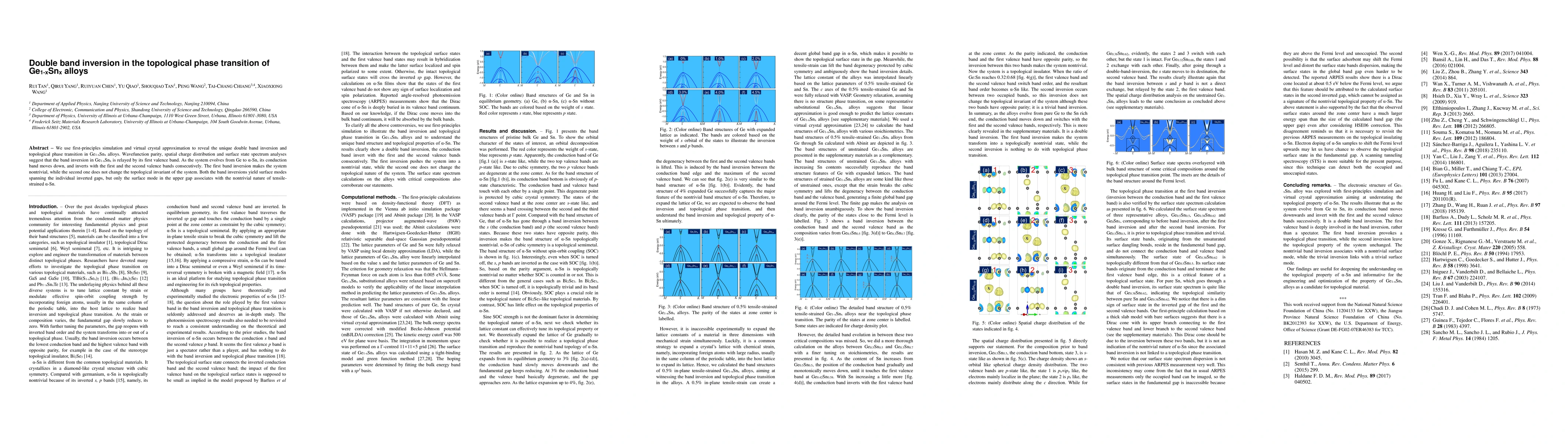 This paper investigates the topological phase transition in Ge1-xSnx alloys using first-principles simulations, revealing a double band inversion primarily driven by the first valence band. The transition results in nontrivial topological states, with surface modes associated with the upper inverted gap in tensile-strained α-Sn.