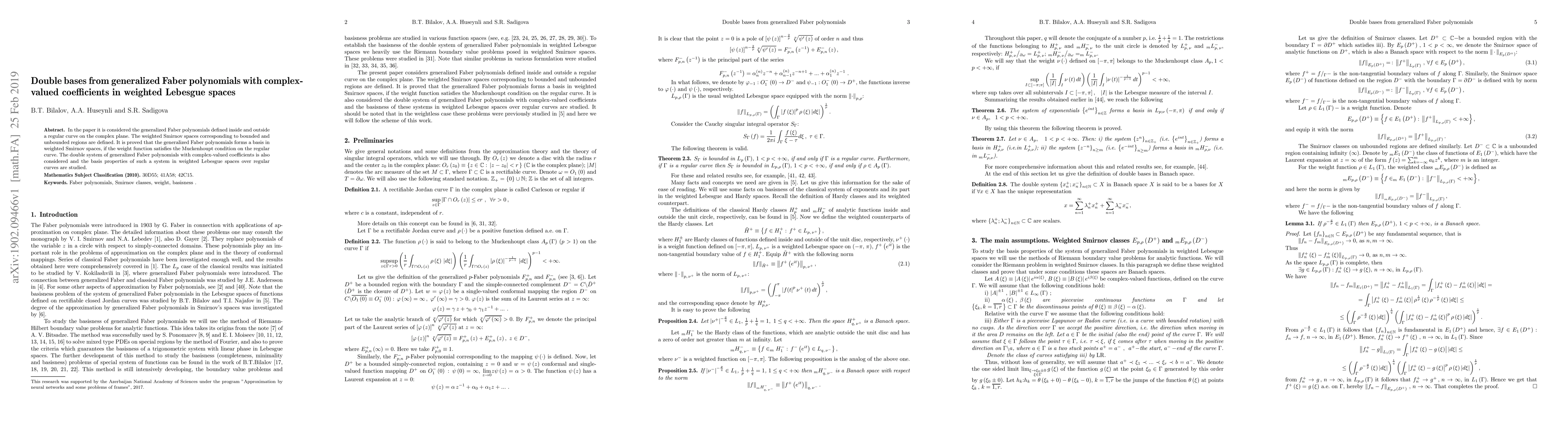 The paper examines generalized Faber polynomials with complex coefficients inside and outside a regular curve, proving they form a basis in weighted Smirnov spaces when the weight function meets the Muckenhoupt condition. It also investigates the basis properties of a double system of these polynomials in weighted Lebesgue spaces over regular curves.