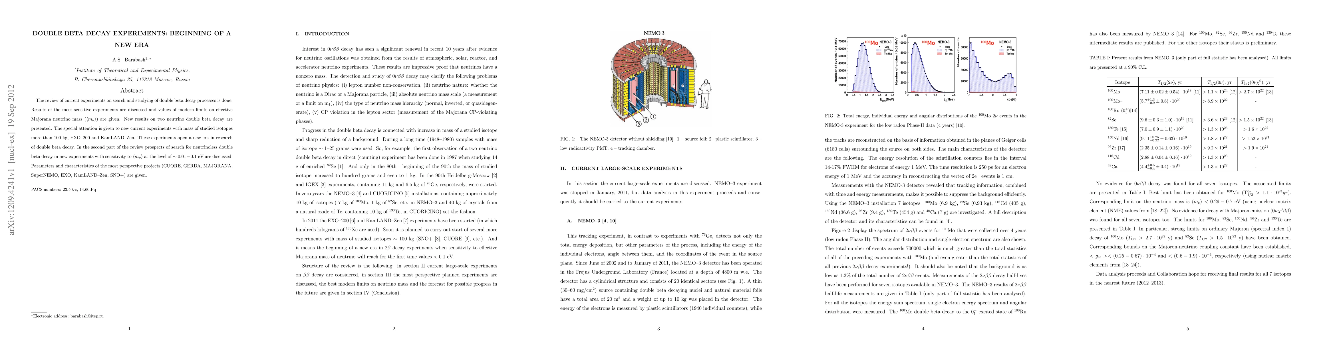 This paper reviews current double beta decay experiments, highlighting the results from the most sensitive experiments and modern limits on the effective Majorana neutrino mass. It focuses on new experiments like EXO-200 and KamLAND-Zen, which use isotopes with masses over 100 kg, marking a new era in this research. The paper also discusses future prospects for neutrinoless double beta decay detection with advanced projects aiming for sensitivity to $<m_{\nu}>$ at the level of 0.01-0.1 eV.