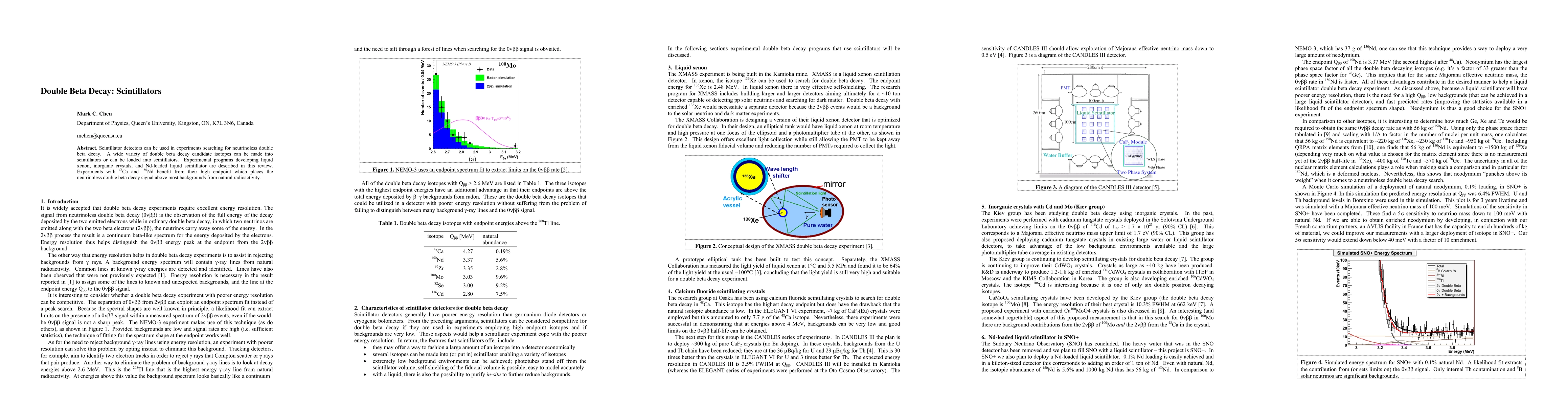 Scintillator detectors can be used in experiments searching for neutrinoless double beta decay. A wide variety of double beta decay candidate isotopes can be made into scintillators or can be loaded into scintillators. Experimental programs developing liquid xenon, inorganic crystals, and Nd-loaded liquid scintillator are described in this review. Experiments with 48Ca and 150Nd benefit from their high endpoint which places the neutrinoless double beta decay signal above most backgrounds from natural radioactivity.
