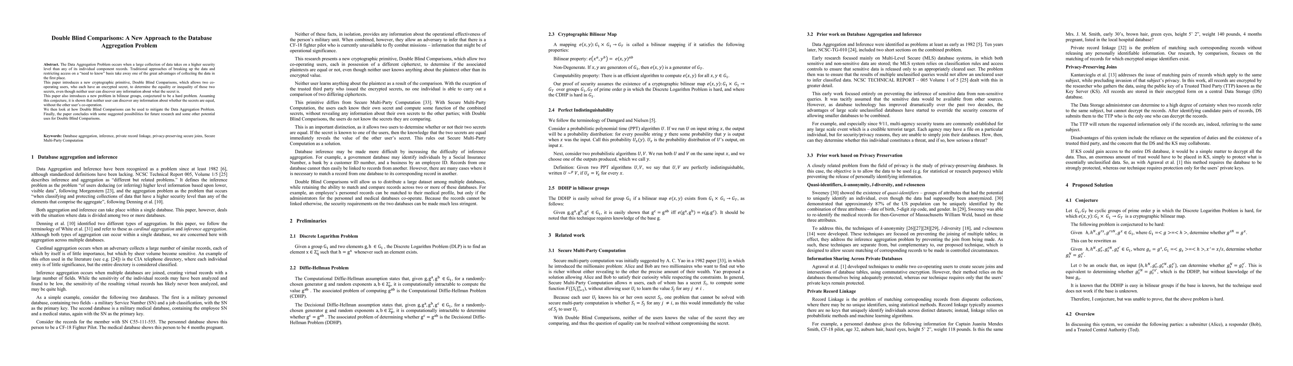 The Data Aggregation Problem occurs when a large collection of data takes on a higher security level than any of its individual component records. Traditional approaches of breaking up the data and restricting access on a "need to know" basis take away one of the great advantages of collecting the data in the first place. This paper introduces a new cryptographic primitive, Double Blind Comparisons, which allows two co-operating users, who each have an encrypted secret, to determine the equality or inequality of those two secrets, even though neither user can discover any information about what the secret is. This paper also introduces a new problem in bilinear groups, conjectured to be a hard problem. Assuming this conjecture, it is shown that neither user can discover any information about whether the secrets are equal, without the other user's co-operation. We then look at how Double Blind Comparisons can be used to mitigate the Data Aggregation Problem. Finally, the paper concludes with some suggested possibilities for future research and some other potential uses for Double Blind Comparisons.