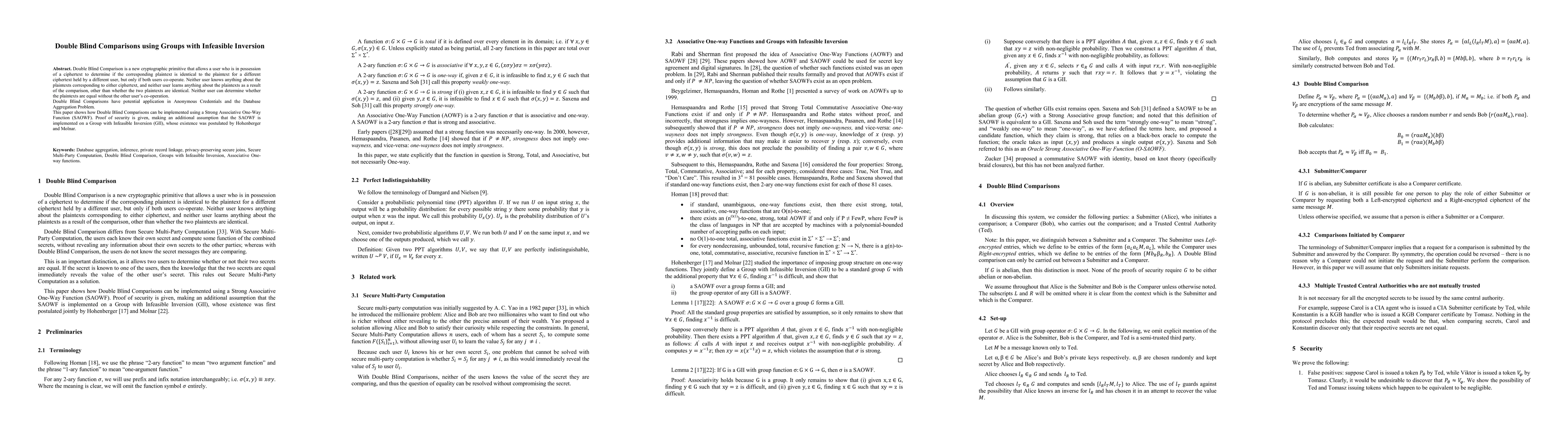 Double Blind Comparison is a new cryptographic primitive that allows a user who is in possession of a ciphertext to determine if the corresponding plaintext is identical to the plaintext for a different ciphertext held by a different user, but only if both users co-operate. Neither user knows anything about the plaintexts corresponding to either ciphertext, and neither user learns anything about the plaintexts as a result of the comparison, other than whether the two plaintexts are identical. Neither user can determine whether the plaintexts are equal without the other user's co-operation. Double Blind Comparisons have potential application in Anonymous Credentials and the Database Aggregation Problem. This paper shows how Double Blind Comparisons can be implemented using a Strong Associative One-Way Function (SAOWF). Proof of security is given, making an additional assumption that the SAOWF is implemented on a Group with Infeasible Inversion (GII), whose existence was postulated by Hohenberger and Molnar.