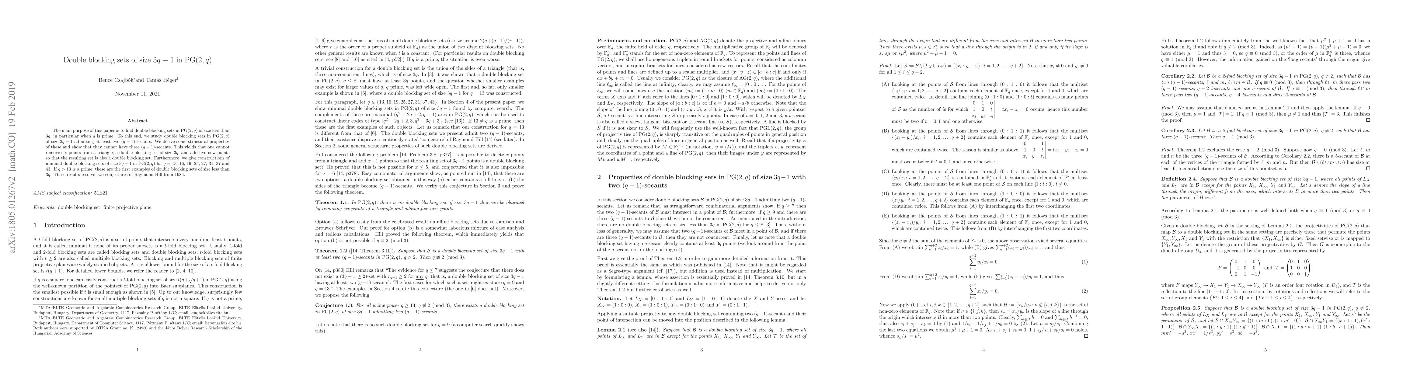 This paper investigates double blocking sets in $\mathrm{PG}(2,q)$ of size $3q-1$ and demonstrates they cannot have three $(q-1)$-secants, resolving conjectures by Raymond Hill. Constructions of minimal double blocking sets of size $3q-1$ for several prime values of $q$ are provided, marking the first examples of such sets for $q > 13$.