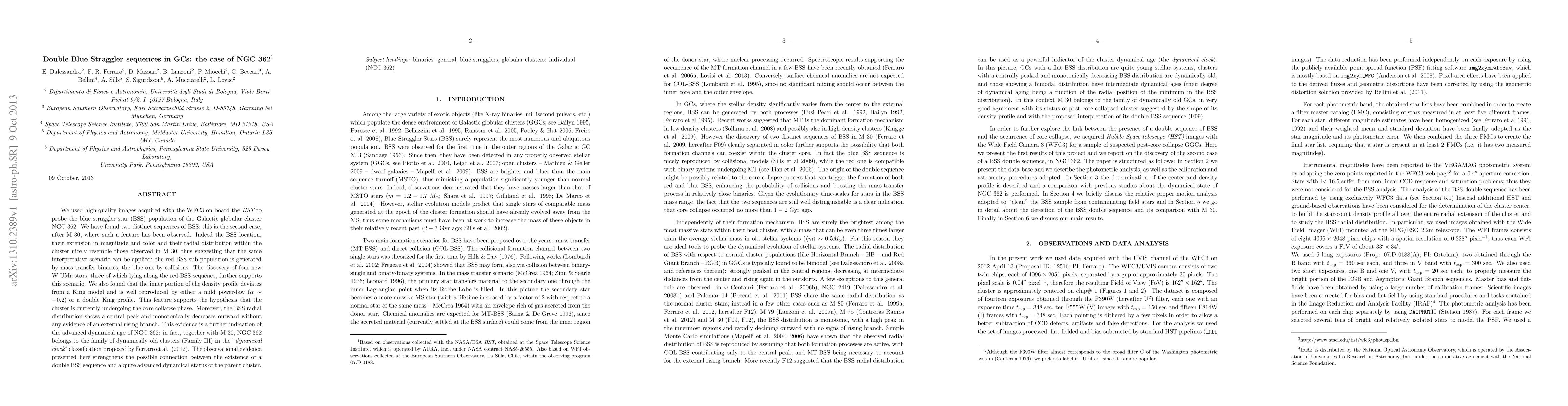 This study identifies two distinct blue straggler star sequences in the globular cluster NGC 362, suggesting that the red sub-population forms via mass transfer binaries and the blue via collisions. The cluster's core collapse and advanced dynamical age are indicated by deviations in its density profile and radial distribution.