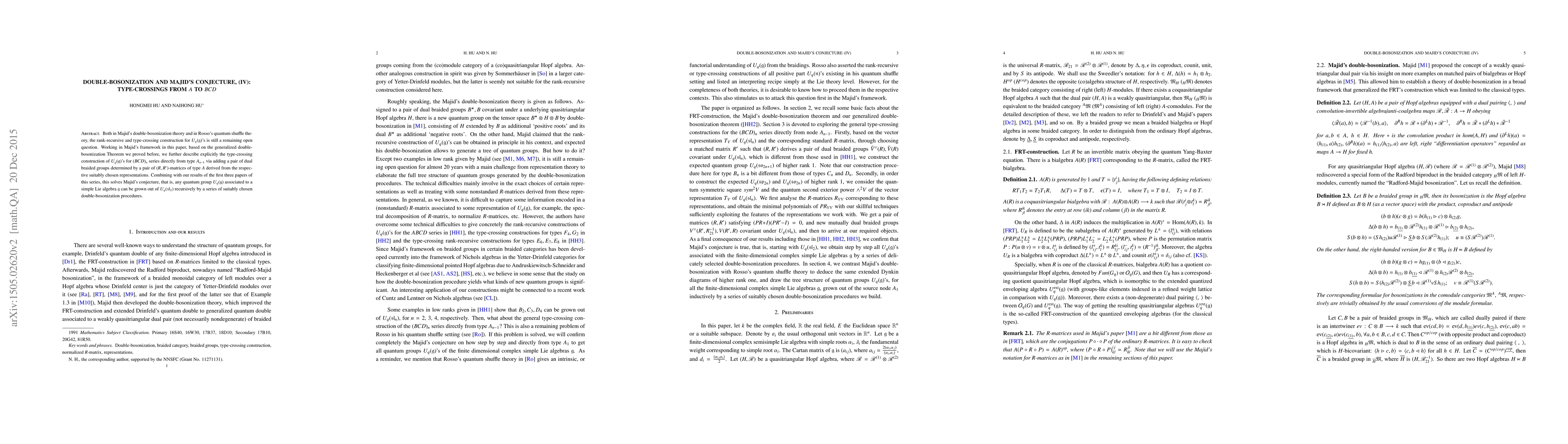 This paper extends Majid's double-bosonization theory to the $(BCD)_n$ series by constructing type-crossings from $A_{n-1}$ using dual braided groups derived from $(R, R')$-matrices. This work, combined with previous results, confirms Majid's conjecture that any $U_q(\mathfrak g)$ can be built from $U_q({\mathfrak {sl}}_2)$ through a series of double-bosonizations.