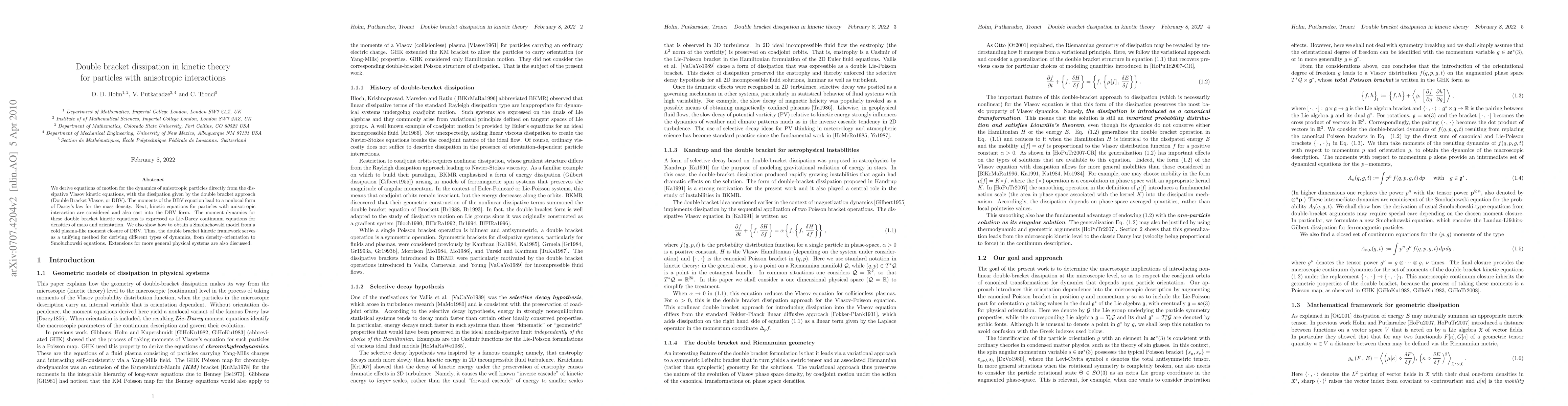 We derive equations of motion for the dynamics of anisotropic particles directly from the dissipative Vlasov kinetic equations, with the dissipation given by the double bracket approach (Double Bracket Vlasov, or DBV). The moments of the DBV equation lead to a nonlocal form of Darcy's law for the mass density. Next, kinetic equations for particles with anisotropic interaction are considered and also cast into the DBV form. The moment dynamics for these double bracket kinetic equations is expressed as Lie-Darcy continuum equations for densities of mass and orientation. We also show how to obtain a Smoluchowski model from a cold plasma-like moment closure of DBV. Thus, the double bracket kinetic framework serves as a unifying method for deriving different types of dynamics, from density--orientation to Smoluchowski equations. Extensions for more general physical systems are also discussed.