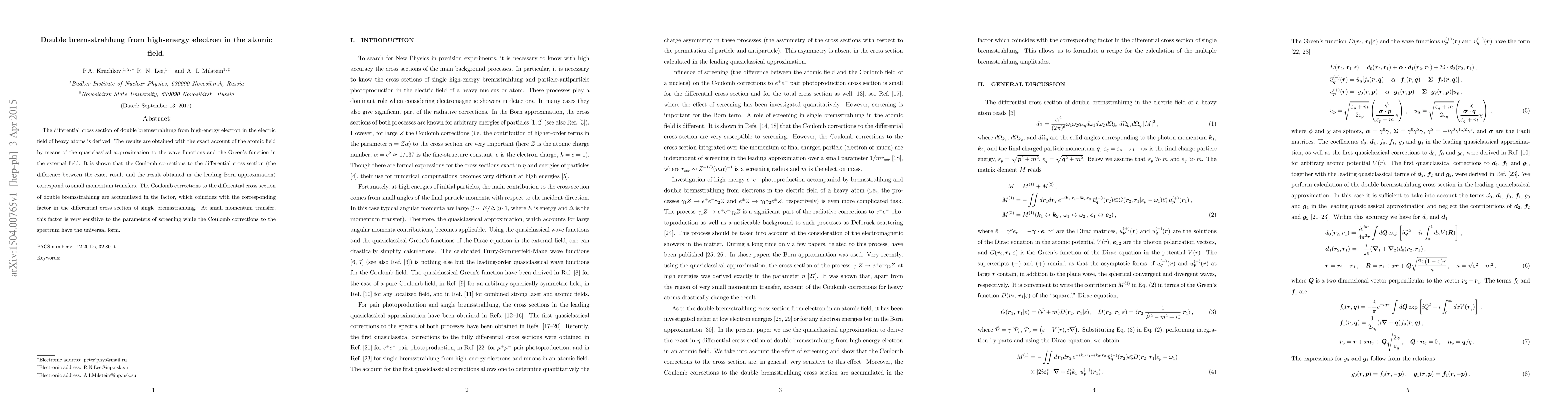 The differential cross section of double bremsstrahlung from high-energy electron in the electric field of heavy atoms is derived. The results are obtained with the exact account of the atomic field by means of the quasiclassical approximation to the wave functions and the Green's function in the external field. It is shown that the Coulomb corrections to the differential cross section (the difference between the exact result and the result obtained in the leading Born approximation) correspond to small momentum transfers. The Coulomb corrections to the differential cross section of double bremsstrahlung are accumulated in the factor, which coincides with the corresponding factor in the differential cross section of single bremsstrahlung. At small momentum transfer, this factor is very sensitive to the parameters of screening while the Coulomb corrections to the spectrum have the universal form.