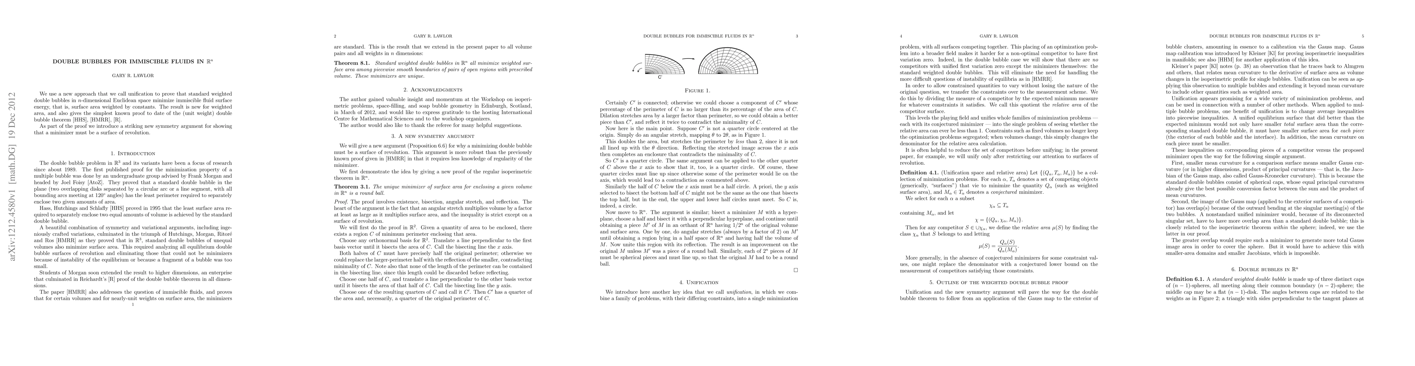 We use a new approach that we call unification to prove that standard weighted double bubbles in $n$-dimensional Euclidean space minimize immiscible fluid surface energy, that is, surface area weighted by constants. The result is new for weighted area, and also gives the simplest known proof to date of the (unit weight) double bubble theorem. As part of the proof we introduce a striking new symmetry argument for showing that a minimizer must be a surface of revolution.