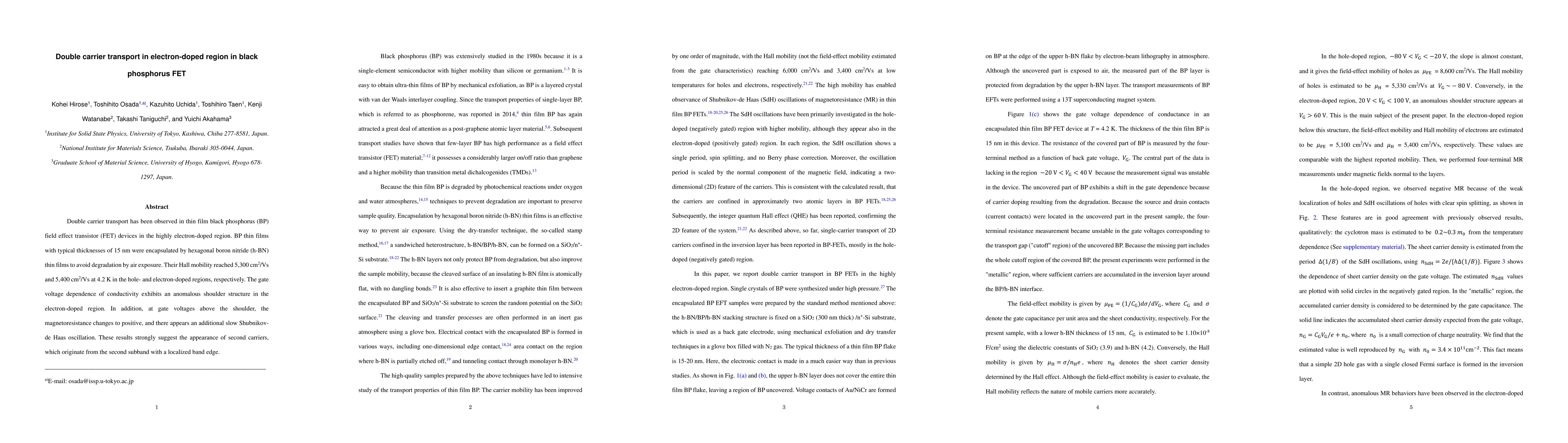 The double carrier transport has been observed in thin film black phosphorus (BP) field effect transistor (FET) devices in highly electron doped region. BP thin films with typical thickness of 15 nm were encapsulated by hexagonal boron nitride (h-BN) thin films to avoid degradation by air exposure. Their Hall mobility has reached 5300 cm2/Vs and 5400 cm2/Vs at 4.2 K in the hole and electron doped regions, respectively. The gate voltage dependence of conductivity exhibits an anomalous shoulder structure in electron doped region. In addition, at gate voltages above the shoulder, the magnetoresistance changes to positive, and there appears an additional slow Shubnikov-de Haas oscillation. These results strongly suggest the appearance of the second carriers, which originate from the second subband with localized band edge.
