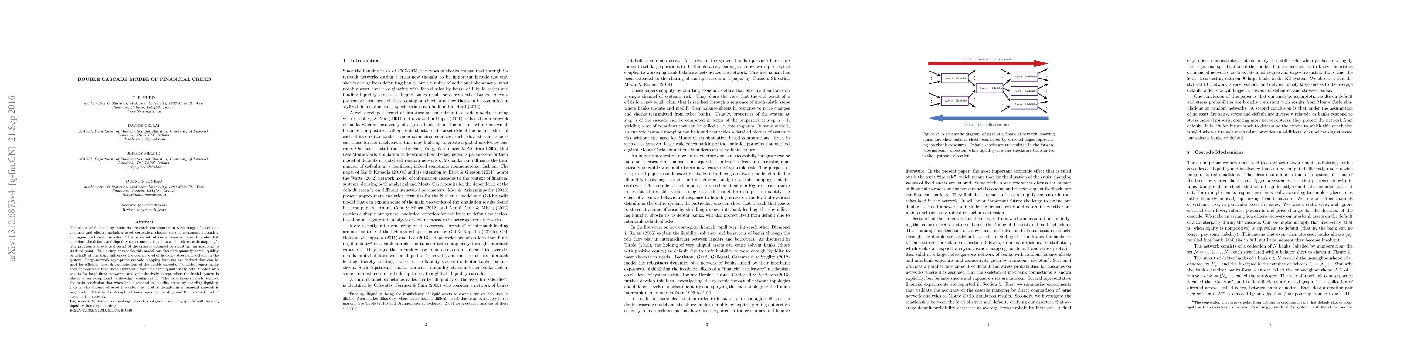 The scope of financial systemic risk research encompasses a wide range of interbank channels and effects, including asset correlation shocks, default contagion, illiquidity contagion, and asset fire sales. This paper introduces a financial network model that combines the default and liquidity stress mechanisms into a "double cascade mapping". The progress and eventual result of the crisis is obtained by iterating this mapping to its fixed point. Unlike simpler models, this model can therefore quantify how illiquidity or default of one bank influences the overall level of liquidity stress and default in the system. Large-network asymptotic cascade mapping formulas are derived that can be used for efficient network computations of the double cascade. Numerical experiments then demonstrate that these asymptotic formulas agree qualitatively with Monte Carlo results for large finite networks, and quantitatively except when the initial system is placed in an exceptional "knife-edge" configuration. The experiments clearly support the main conclusion that when banks respond to liquidity stress by hoarding liquidity, then in the absence of asset fire sales, the level of defaults in a financial network is negatively related to the strength of bank liquidity hoarding and the eventual level of stress in the network.