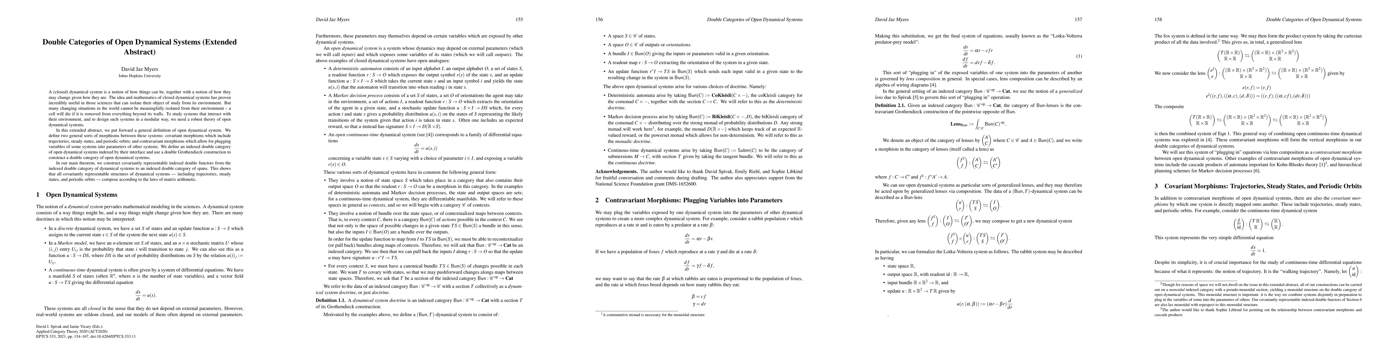 A (closed) dynamical system is a notion of how things can be, together with a notion of how they may change given how they are. The idea and mathematics of closed dynamical systems has proven incredibly useful in those sciences that can isolate their object of study from its environment. But many changing situations in the world cannot be meaningfully isolated from their environment - a cell will die if it is removed from everything beyond its walls. To study systems that interact with their environment, and to design such systems in a modular way, we need a robust theory of open dynamical systems. In this extended abstract, we put forward a general definition of open dynamical system. We define two general sorts of morphisms between these systems: covariant morphisms which include trajectories, steady states, and periodic orbits; and contravariant morphisms which allow for plugging variables of some systems into parameters of other systems. We define an indexed double category of open dynamical systems indexed by their interface and use a double Grothendieck construction to construct a double category of open dynamical systems. In our main theorem, we construct covariantly representable indexed double functors from the indexed double category of dynamical systems to an indexed double category of spans. This shows that all covariantly representable structures of dynamical systems - including trajectories, steady states, and periodic orbits - compose according to the laws of matrix arithmetic.