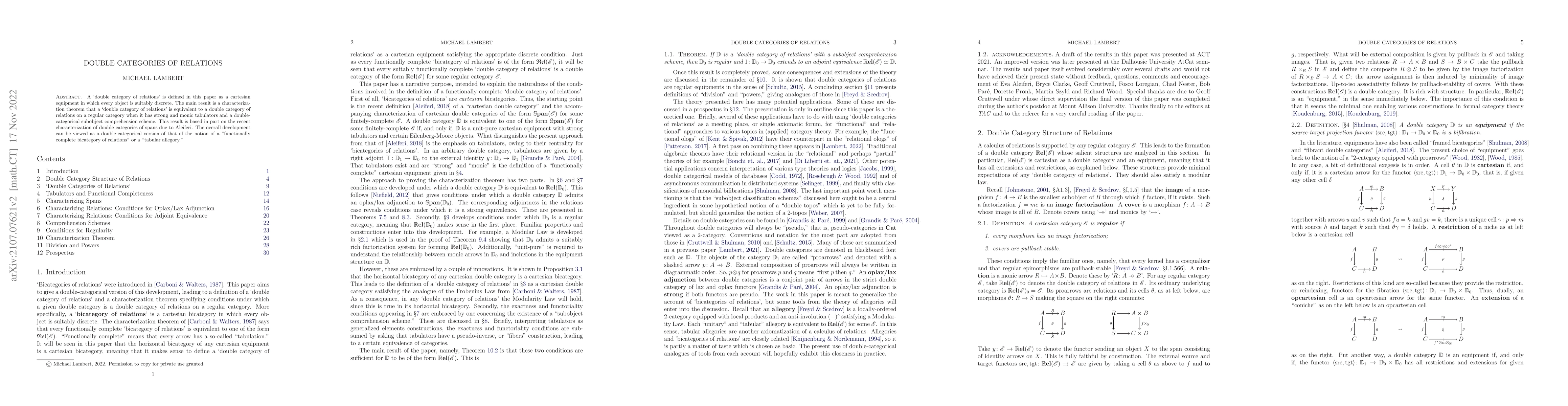 Double categories of relations involve cartesian structures with specific tabulators and Frobenius Laws, analogous to double categories of spans. They are characterized by relations on categories with proper and stable factorization systems.