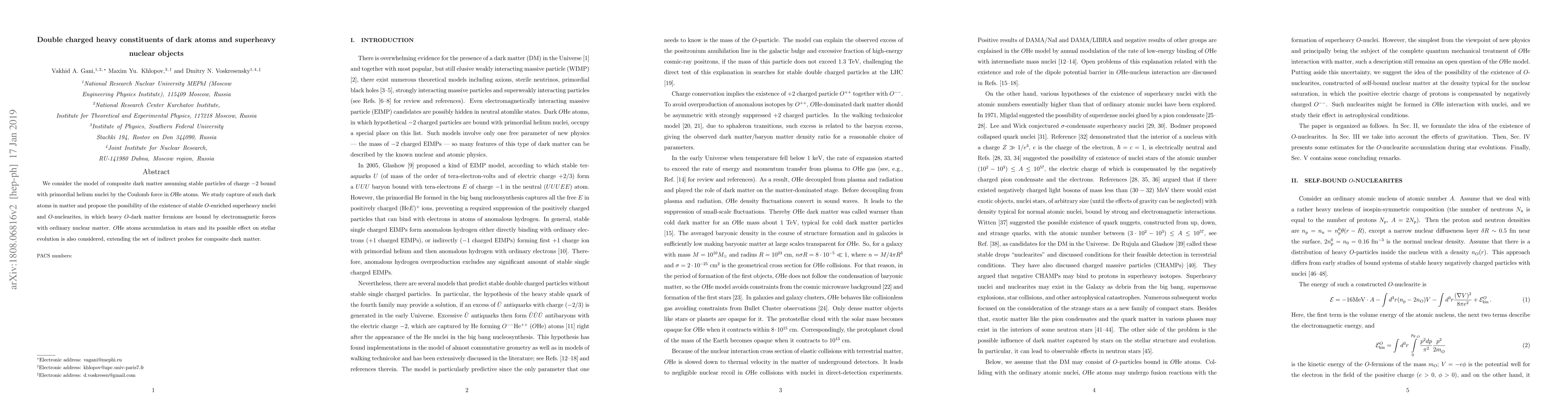 This paper explores a model of composite dark matter where stable particles with charge $-2$ are bound to helium nuclei, forming $O$He atoms. It investigates the capture of these dark atoms in matter and proposes the existence of stable $O$-enriched superheavy nuclei, potentially influencing stellar evolution.