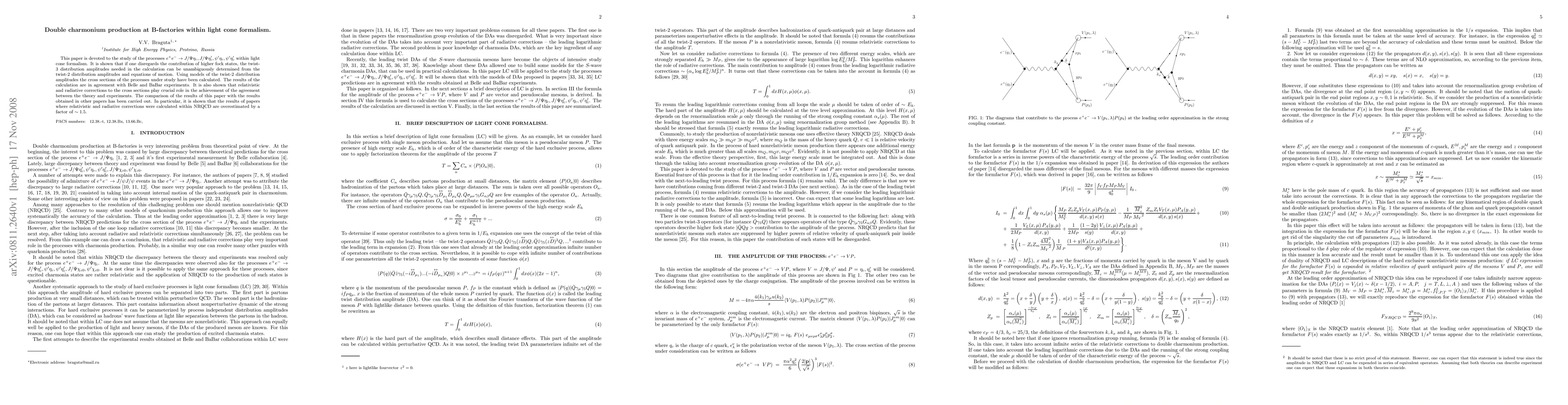 This paper investigates double charmonium production in e^+e^- collisions using light cone formalism, showing that twist-3 distribution amplitudes can be derived from twist-2 amplitudes. The calculated cross sections align with experimental data from Belle and BaBar, highlighting the importance of relativistic and radiative corrections.