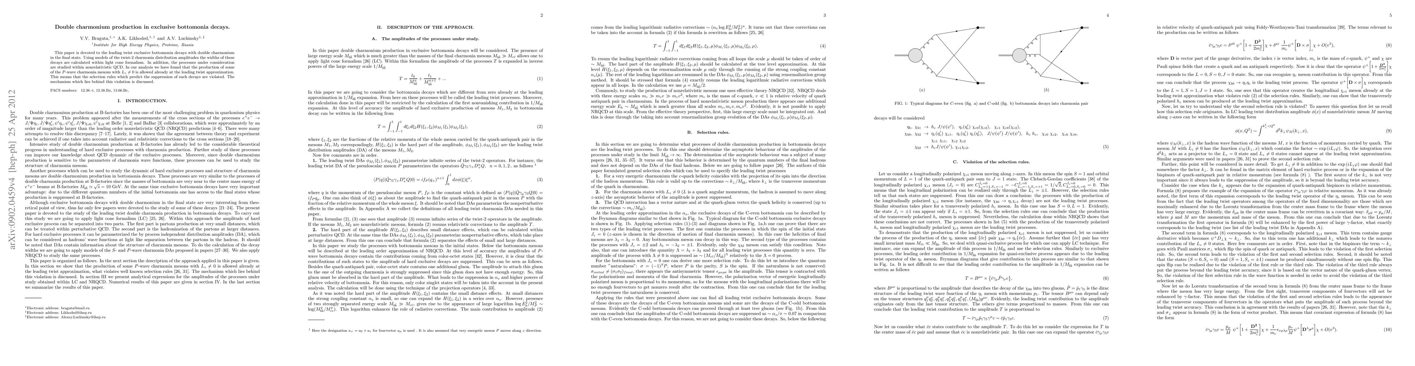The paper presents a detailed calculation of double charmonium production in exclusive bottomonia decays using both light cone formalism and NRQCD, identifying and explaining the violation of selection rules at the leading twist approximation.