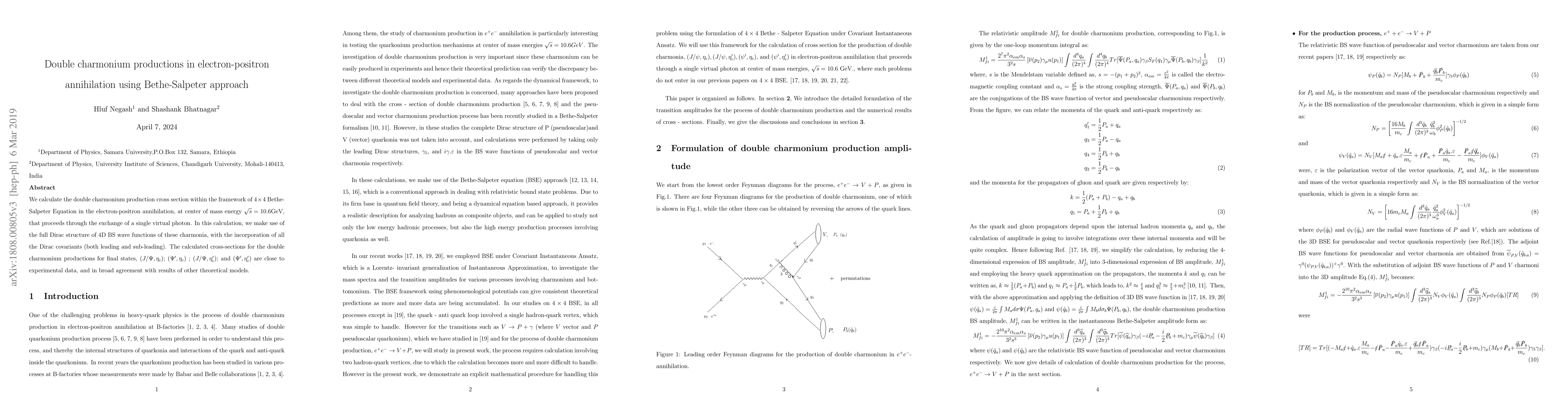 We calculate the double charmonium production cross section within the framework of $4\times 4$ Bethe-Salpeter Equation in the electron-positron annihilation, at center of mass energy $\sqrt{s}= 10.6$GeV, that proceeds through the exchange of a single virtual photon. In this calculation, we make use of the full Dirac structure of 4D BS wave functions of these charmonia, with the incorporation of all the Dirac covariants (both leading and sub-leading). The calculated cross-sections for the double charmonium productions for final states, ($J/\Psi, \eta_c$); ($\Psi',\eta_c$) ; ($J/\Psi, \eta_c'$); and ($\Psi',\eta_c'$) are close to experimental data, and in broad agreement with results of other theoretical models.