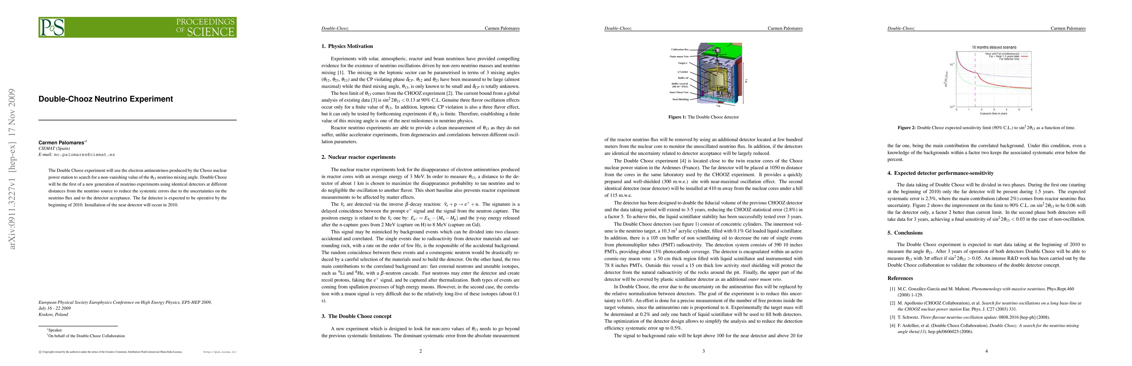 The Double Chooz experiment aims to measure the neutrino mixing angle θ13 by detecting electron antineutrinos from the Chooz nuclear power station. It uses two identical detectors at different distances from the neutrino source to reduce systematic errors related to neutrino flux uncertainties and detector acceptance.