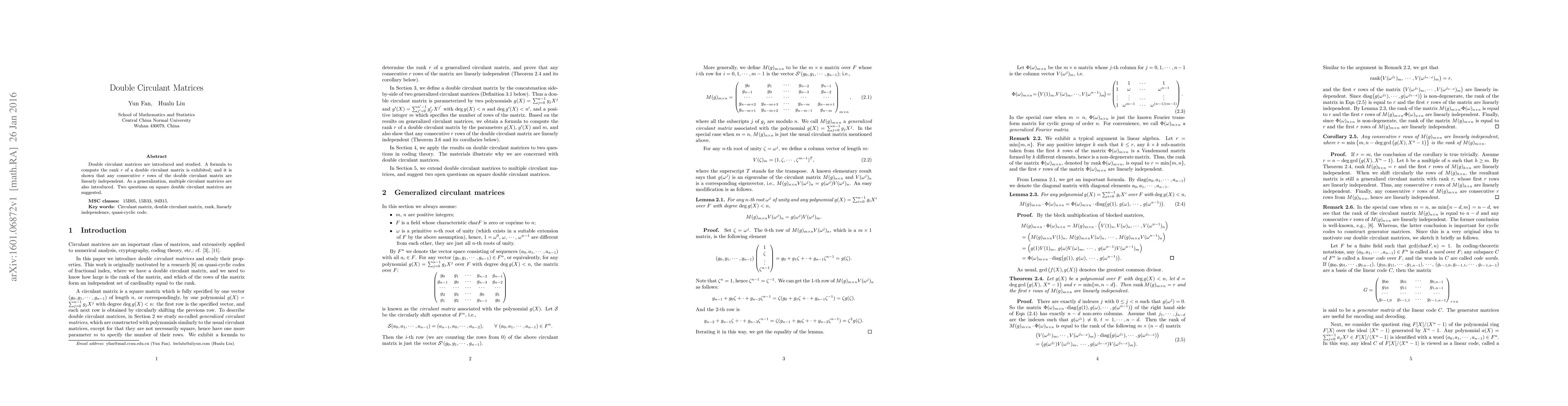Summary: This paper introduces double circulant matrices, provides a formula to determine their rank, and proves that any consecutive rank number of rows are linearly independent. It also generalizes to multiple circulant matrices and poses two questions regarding square double circulant matrices.