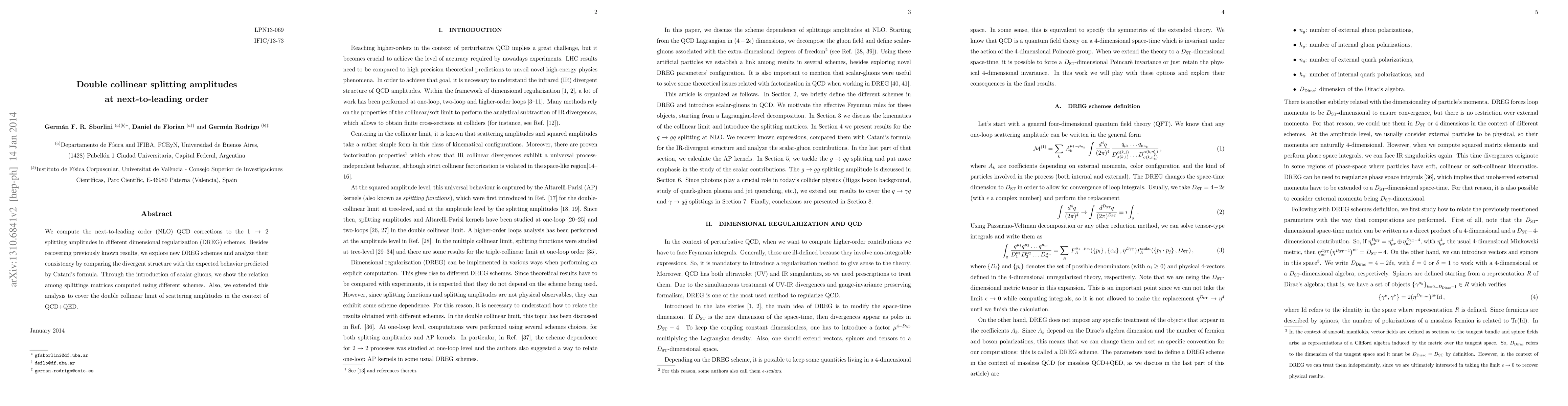We compute the next-to-leading order (NLO) QCD corrections to the $1 \to 2$ splitting amplitudes in different dimensional regularization (DREG) schemes. Besides recovering previously known results, we explore new DREG schemes and analyze their consistency by comparing the divergent structure with the expected behavior predicted by Catani's formula. Through the introduction of scalar-gluons, we show the relation among splittings matrices computed using different schemes. Also, we extended this analysis to cover the double collinear limit of scattering amplitudes in the context of QCD+QED.