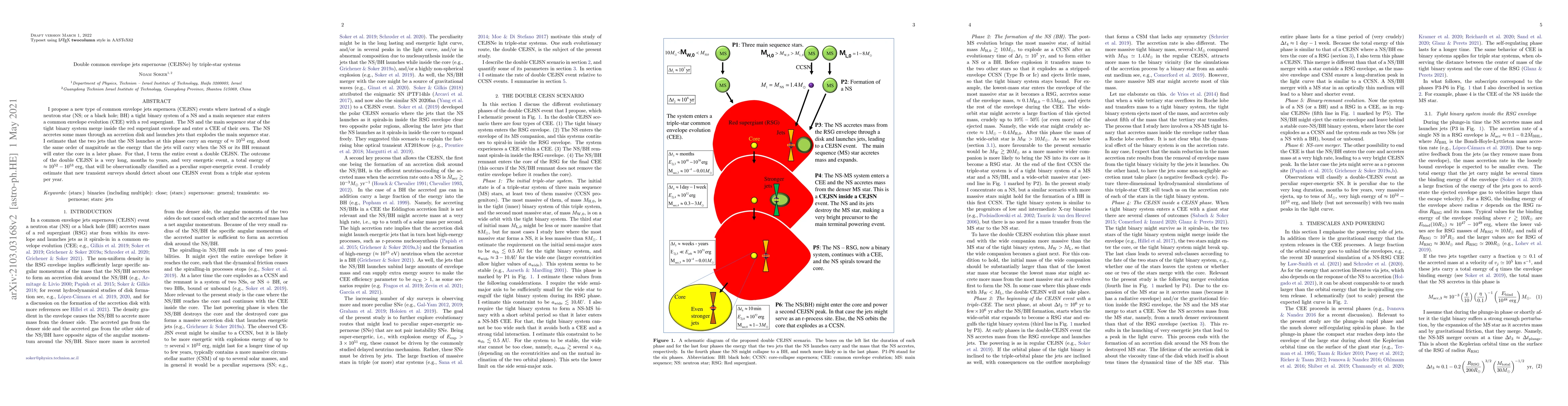 I propose a new type of common envelope jets supernova (CEJSN) events where instead of a single neutron star (NS; or a black hole; BH) a tight binary system of a NS and a main sequence star enters a common envelope evolution (CEE) with a red supergiant. The NS and the main sequence star of the tight binary system merge inside the red supergiant envelope and enter a CEE of their own. The NS accretes some mass through an accretion disk and launches jets that explodes the main sequence star. I estimate that the two jets that the NS launches at this phase carry an energy of ~10^{52} erg, about the same order of magnitude as the energy that the jets will carry when the NS or its BH remnant will enter the core in a later phase. For that, I term the entire event a double CEJSN. The outcome of the double CEJSN is a very long, months to years, and very energetic event, a total energy of ~10^{52} - 10^{53} erg, that will be observationally classified as a peculiar super-energetic event. I crudely estimate that new transient surveys should detect about one CEJSN event from a triple star system per year.