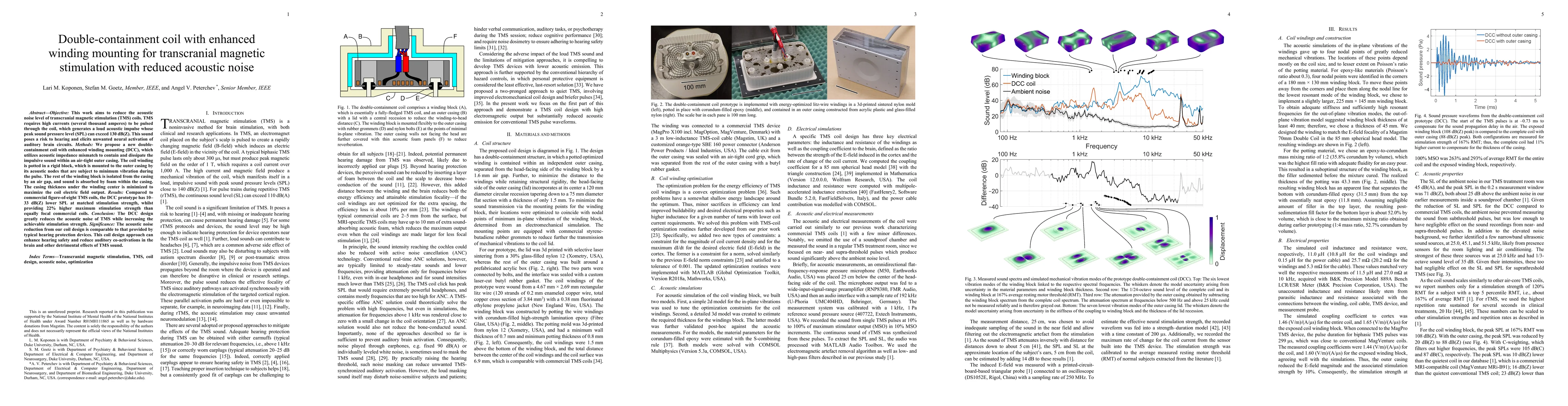 This paper proposes a double-containment coil with enhanced winding mounting to reduce acoustic noise from transcranial magnetic stimulation (TMS), achieving 10-33 dB(Z) lower sound pressure levels compared to commercial coils while increasing stimulation strength by 22%. The design aims to improve hearing safety and minimize auditory neural activations.