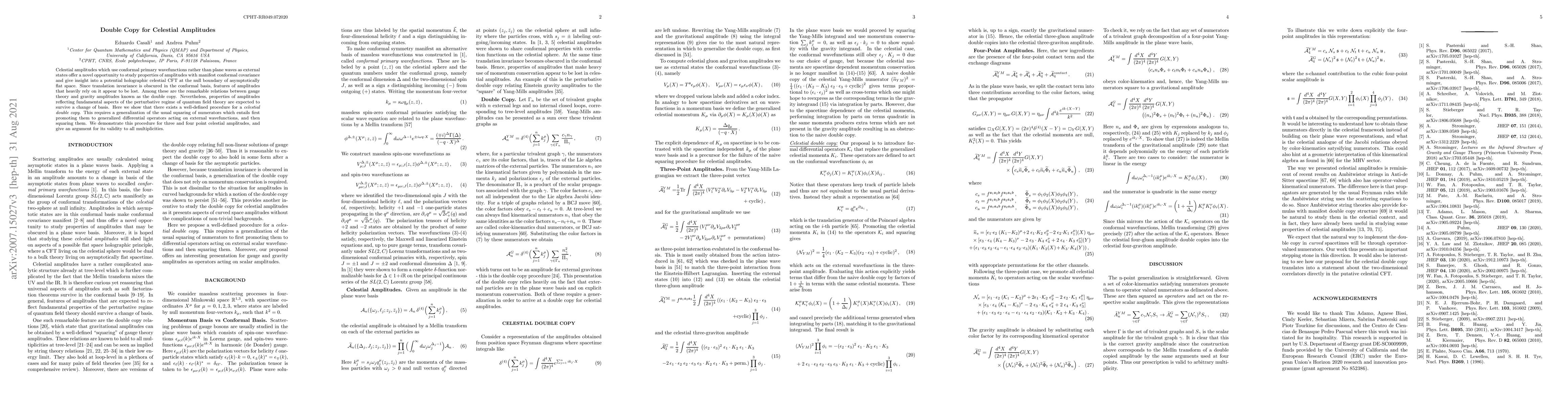 The paper introduces a method for deriving a celestial double copy, demonstrating that fundamental properties of gauge theory and gravity amplitudes persist even when using conformal primary wavefunctions instead of plane waves. This involves generalizing the usual double copy procedure by squaring generalized differential operators acting on external wavefunctions.