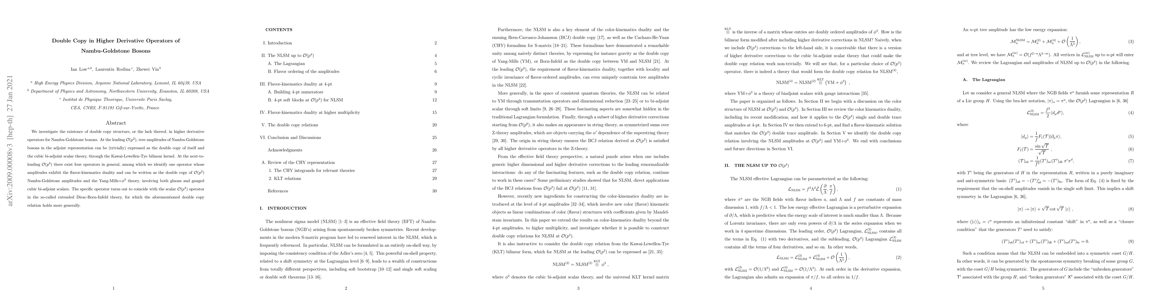 This paper explores the double copy structure in higher derivative operators for Nambu-Goldstone bosons, finding that at ${\cal O}(p^2)$ the tree amplitudes can be trivially expressed as a double copy of themselves and cubic bi-adjoint scalar theory. At ${\cal O}(p^4)$, it identifies a specific operator whose amplitudes exhibit flavor-kinematics duality and can be written as a double copy of ${\cal O}(p^2)$ amplitudes and Yang-Mills+$\phi^3$ theory.