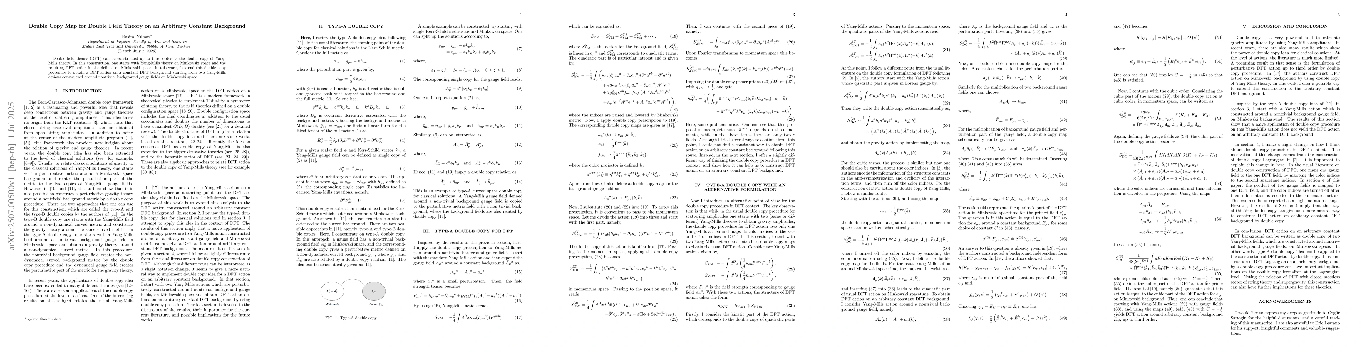 Double field theory (DFT) can be constructed up to third order as the double copy of Yang- Mills theory. In this construction, one starts with Yang-Mills theory on Minkowski space and the resulting DFT action is also defined on Minkowski space. In this work, I extend this double copy procedure to obtain a DFT action on a constant DFT background starting from two Yang-Mills actions constructed around nontrivial background gauge fields on Minkowski space.