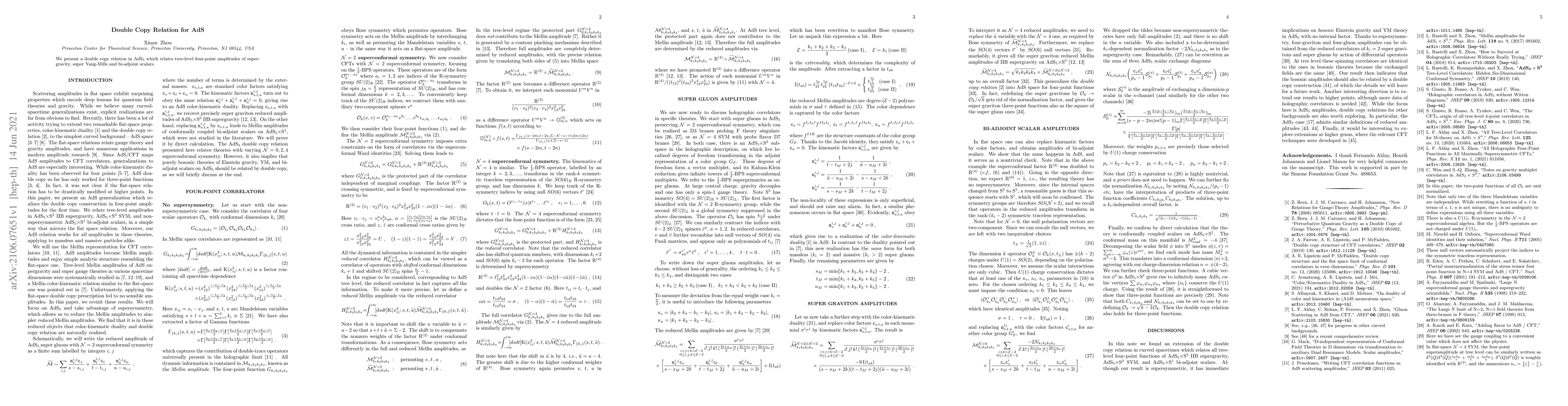 We present a double copy relation in AdS$_5$ which relates tree-level four-point amplitudes of supergravity, super Yang-Mills and bi-adjoint scalars.