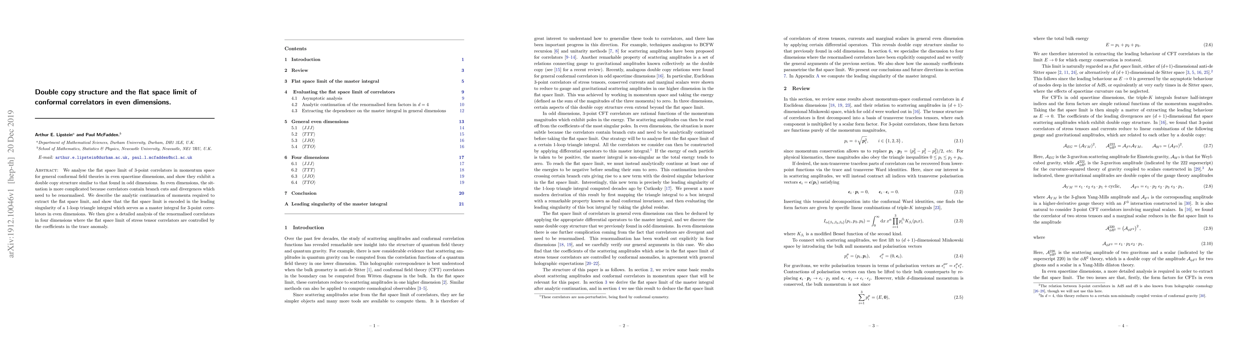 This paper explores the flat space limit of 3-point correlators in even-dimensional conformal field theories, revealing a double copy structure akin to odd dimensions despite additional complexities from branch cuts and divergences. It focuses on the analytic continuation necessary to extract this limit and identifies a 1-loop triangle integral as the master integral for 3-point correlators in even dimensions, providing a detailed analysis of renormalised correlators in four dimensions linked to trace anomaly coefficients.