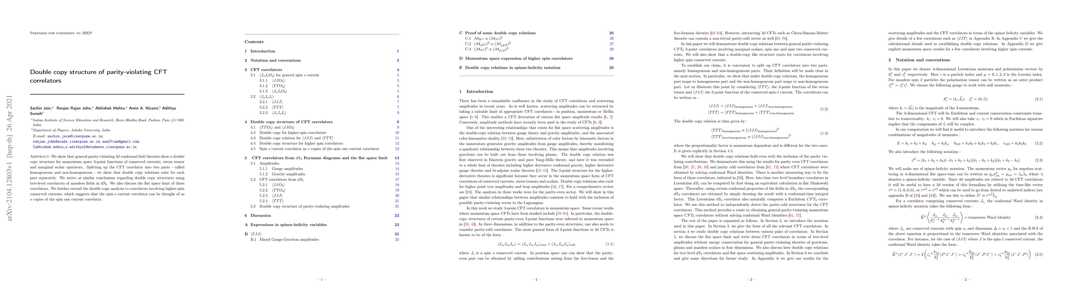 This paper demonstrates that parity-violating 3D conformal field theories exhibit a double copy structure in their momentum space 3-point functions involving conserved currents, stress tensor, and marginal scalar operators, with separate double copy relations for homogeneous and non-homogeneous parts. The findings are also applicable to de Sitter space correlators and extend to higher-spin conserved currents.