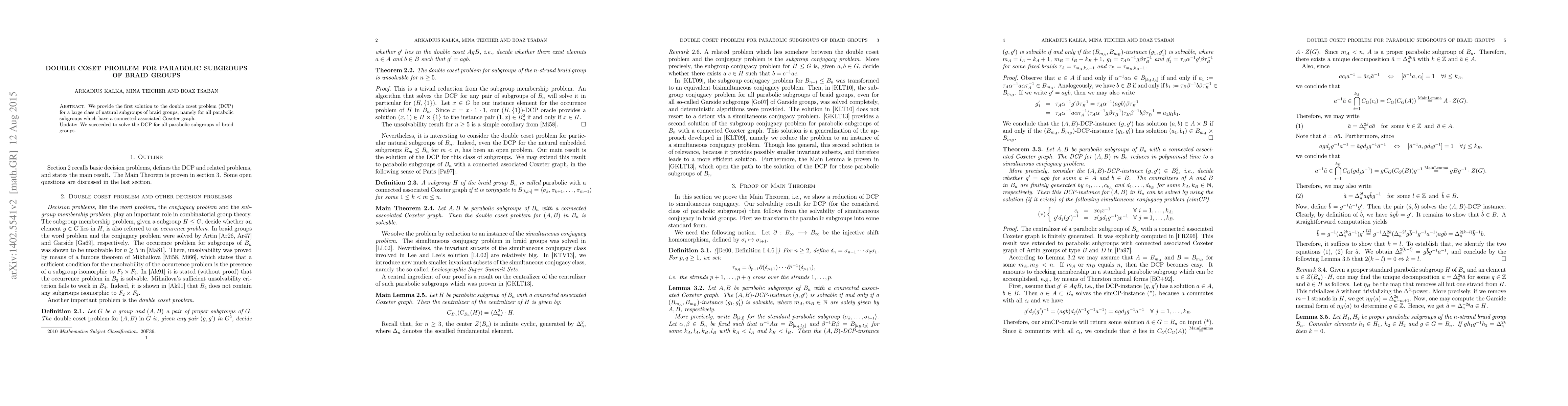 Summary: This paper presents the first solution to the double coset problem for parabolic subgroups of braid groups with connected Coxeter graphs. The authors successfully resolve the double coset problem for all such parabolic subgroups.