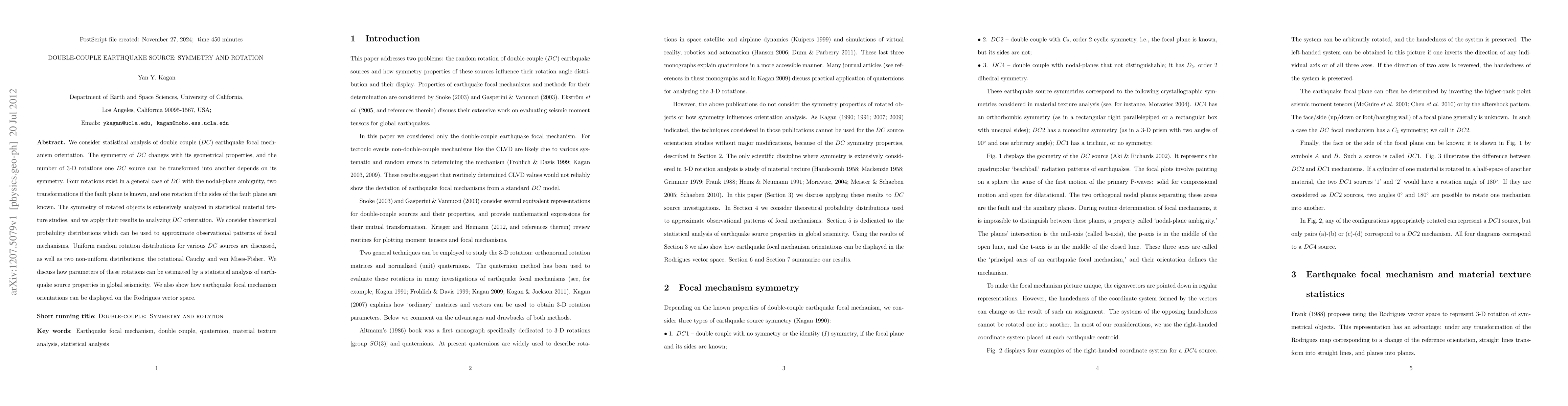 This paper analyzes the symmetry of double-couple earthquake focal mechanisms and the number of 3-D rotations that can transform one source into another based on its symmetry. It discusses theoretical probability distributions to approximate observational patterns and estimates parameters using statistical analysis of global seismicity.