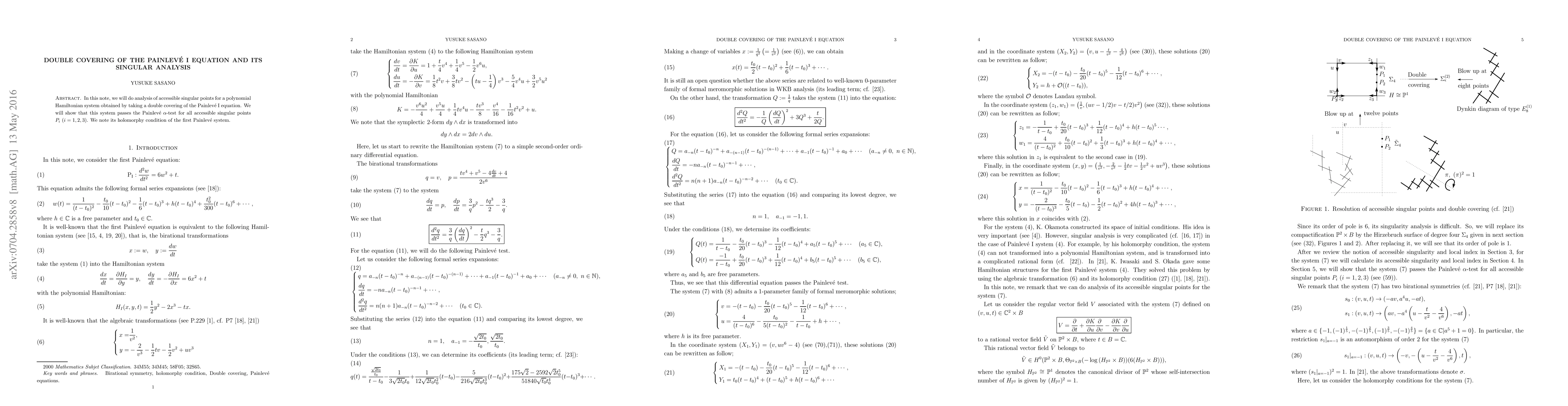 In this note, we will do analysis of accessible singular points for a polynomial Hamiltonian system obtained by taking a double covering of the Painlev\'e I equation. We will show that this system passes the Painlev\'e $\alpha$-test for all accessible singular points $P_i \ (i=1,2,3)$. We note its holomorphy condition of the first Painlev\'e system.