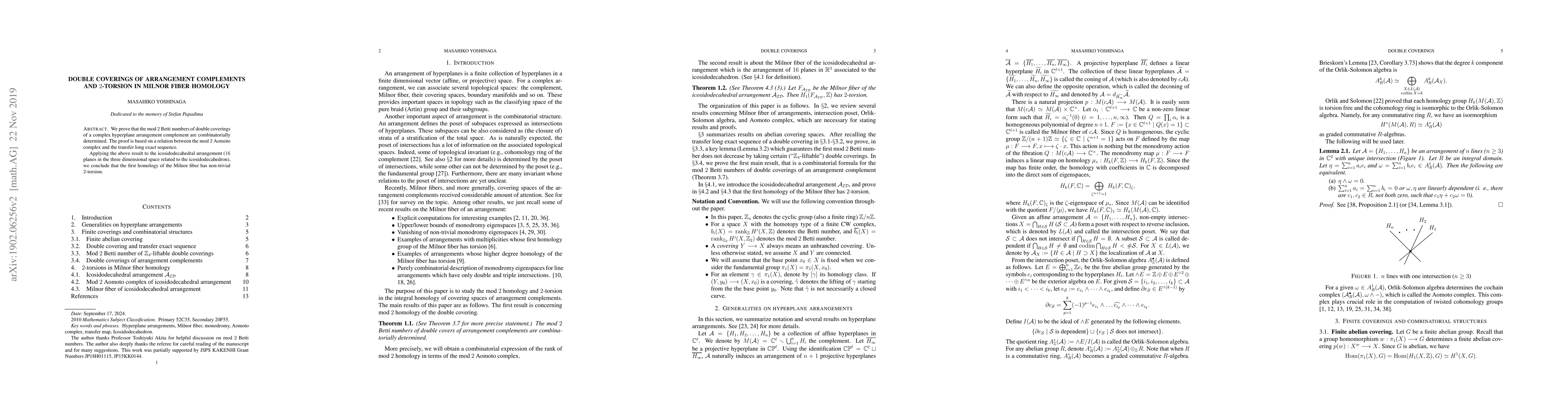 Summary: This paper demonstrates that the mod 2 Betti numbers of double coverings of complex hyperplane arrangements are combinatorially determined, using the Aomoto complex and transfer long exact sequence. It applies this result to the icosidodecahedral arrangement, showing non-trivial 2-torsion in the first homology of its Milnor fiber.