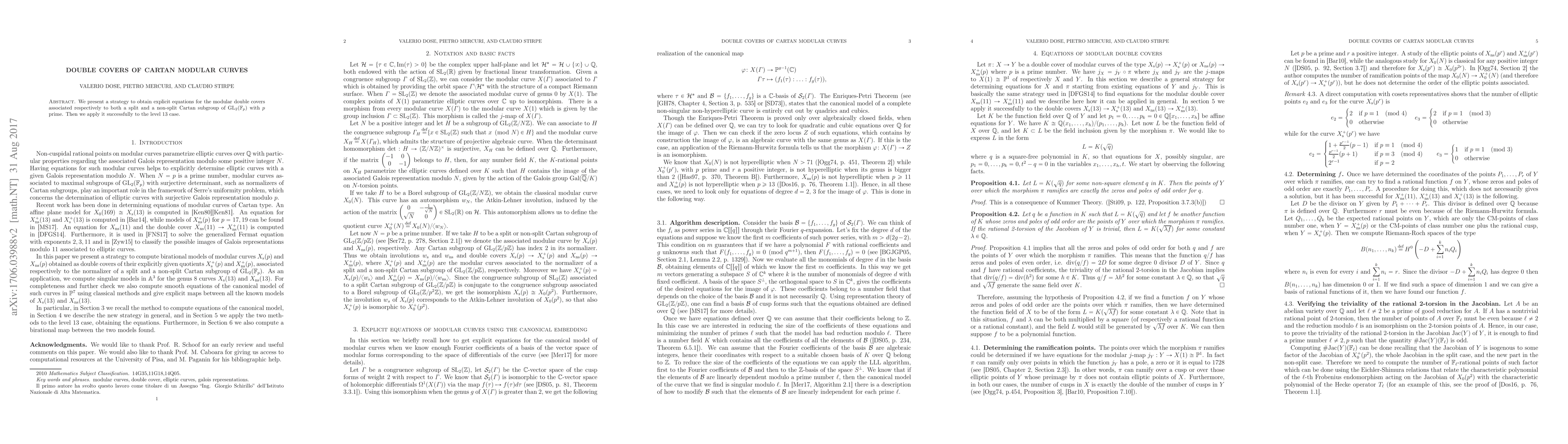 Summary: This paper details a method for deriving explicit equations for modular double covers linked to split and non-split Cartan subgroups in $\text{GL}_2(\mathbb F_{p})$, and demonstrates its application to the level $13$ case.